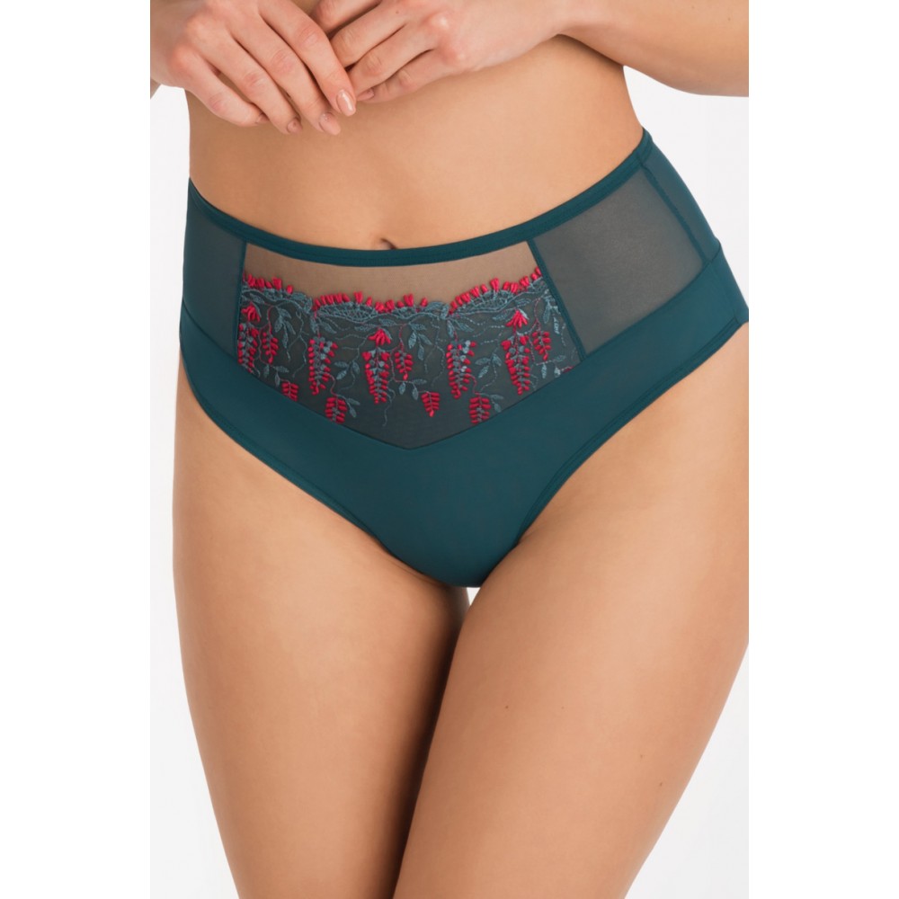 ТРУСИКИ FULL K 797 с высокой талией, закрывают почти всю ягодицу. ПЕРЕДНЯЯ ЧАСТЬ: вышивка на подкладке из прочного тюля, боковины из одного слоя эластичного тюля, нижняя часть из двух слоев эластичного тюля, штанины отделаны узкой резинкой. СПИНКА: полностью из эластичного тюля (один слой по бокам, 2 посередине), штанины плавно сложены. Пояс отделан более широкой резинкой. Состав: 90% полиамид, 7% эластан, 3% полиэстер.