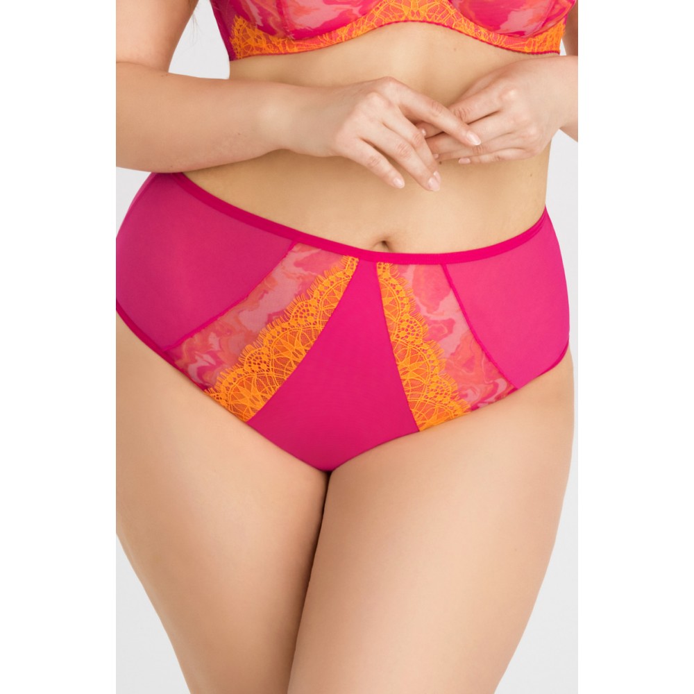 Высокая талия Закрытый крой, покрывающий почти всю ягодицу Изготовлен из эластичного тюля с кружевными элементами на принтованном тюле Спинка из эластичного тюля с гладкой отделкой, чтобы трусики не выделялись под одеждой Хлопковая вставка в области талии Треугольный вырез сзади на талии