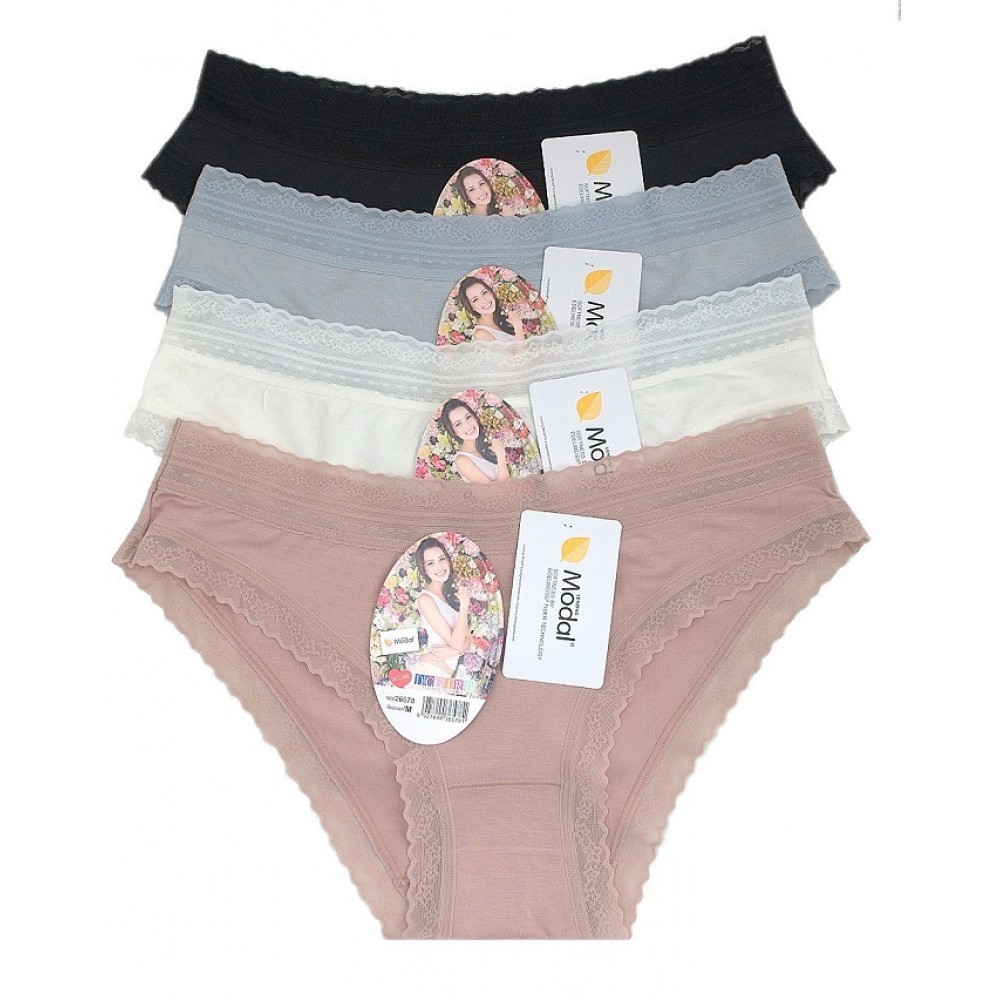 Женские трусики из высококачественного модала. Украшены нежным кружевом. Исключительно мягкие и приятные на ощупь. Упакованы по 12 штук в разных цветах и размерах. Состав: 94% модал, 6% эластан.