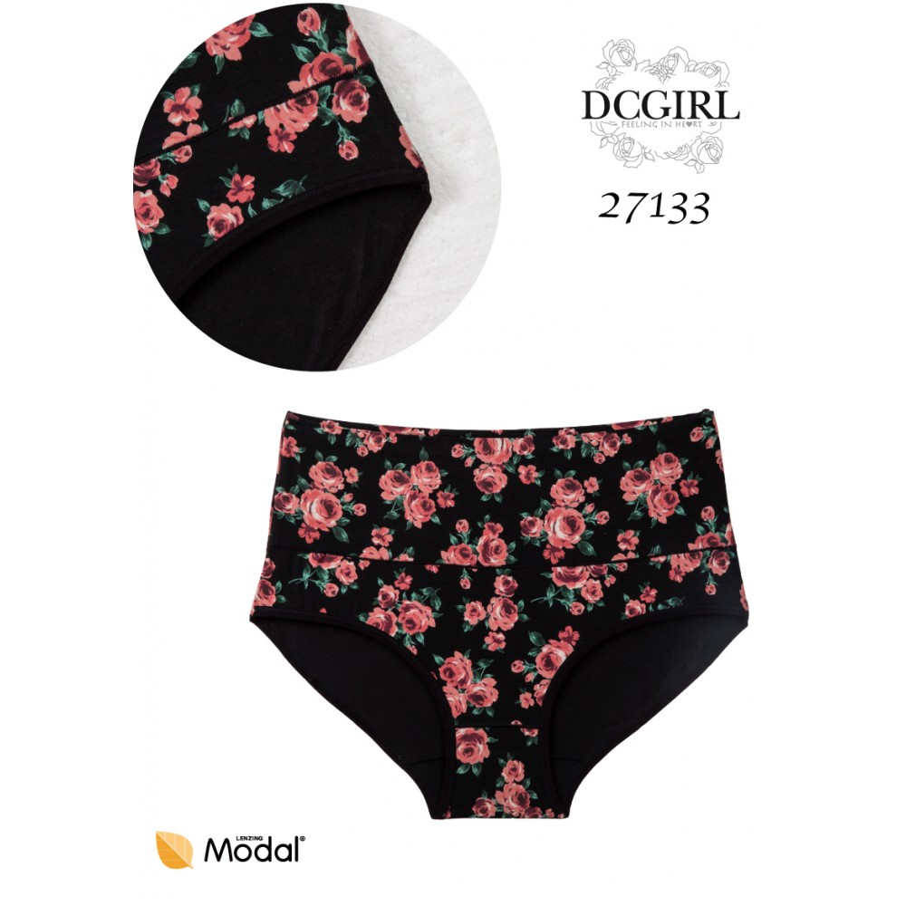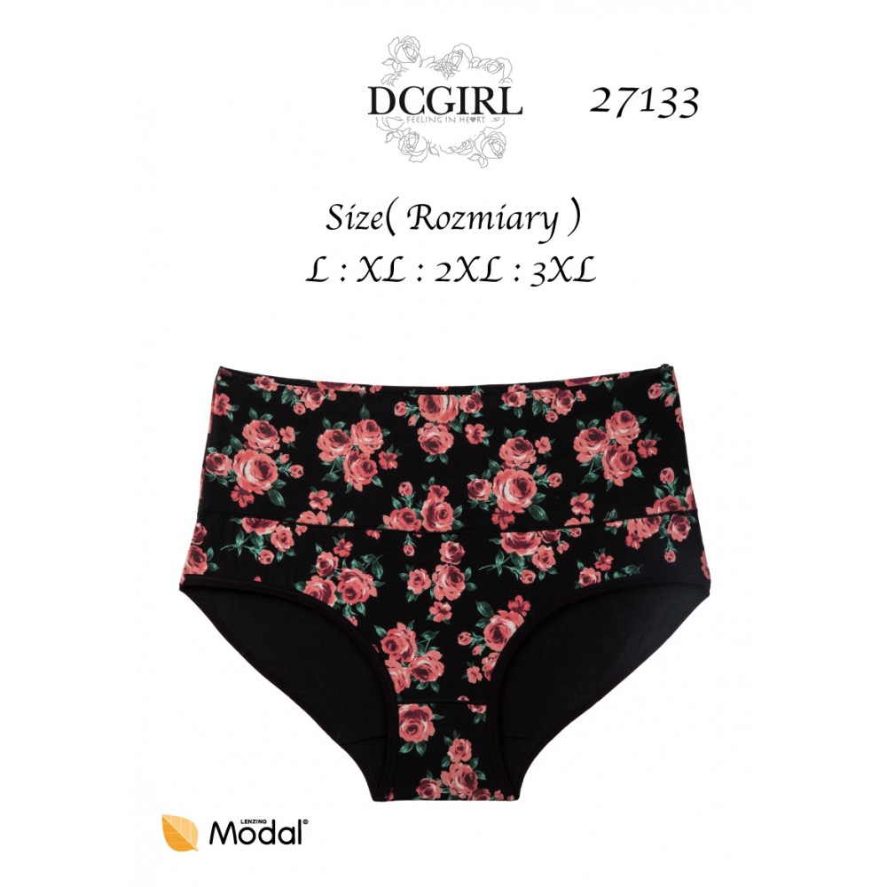 Figi damskie z wyższym stanem wykonane z miękkiego modalu, ozdobione wzorem w kwiaty. Pakowane po 12 sztuk. W opakowaniu mix rozmiarów (M,L,XL). Skład: 94% modal, 6% elastan.