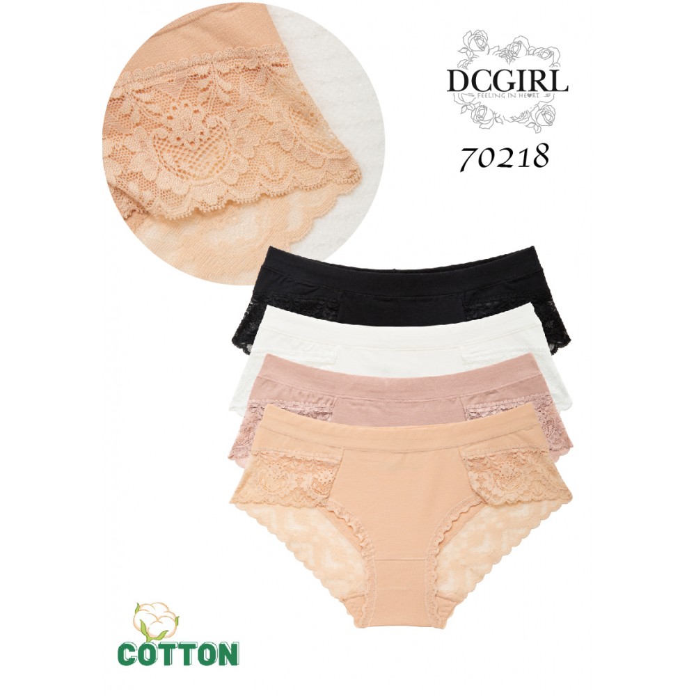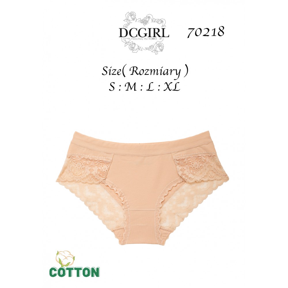 Gładkie figi o klasycznym kroju z miękkiego i oddychającego materiału, króry bardzo dobrze układa się i dopasowywuje do ciała. Boki i tył ozdobione koronką. Pakowane po 12 szt. w mixie kolorów i rozmiarów (S,M,L, XL). Skład: 95% bawełna, 5% spandex.