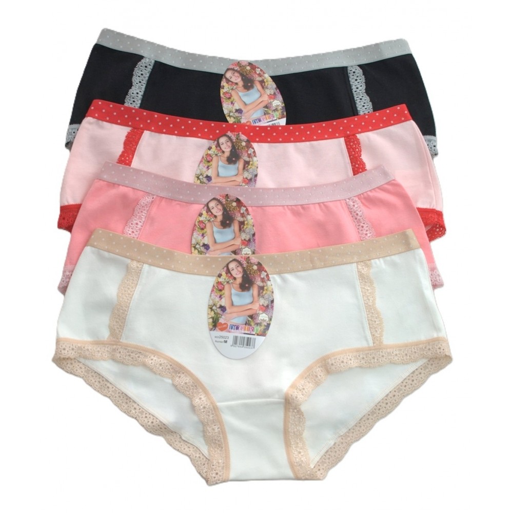Женские хлопковые трусики. Пояс украшен тонкой отделкой в горошек, а штанины отделаны мягким кружевом. В упаковке 12 штук. В разных размерах (S, M, L, XL) и цветах. Состав: 95% хлопок, 5% эластан.