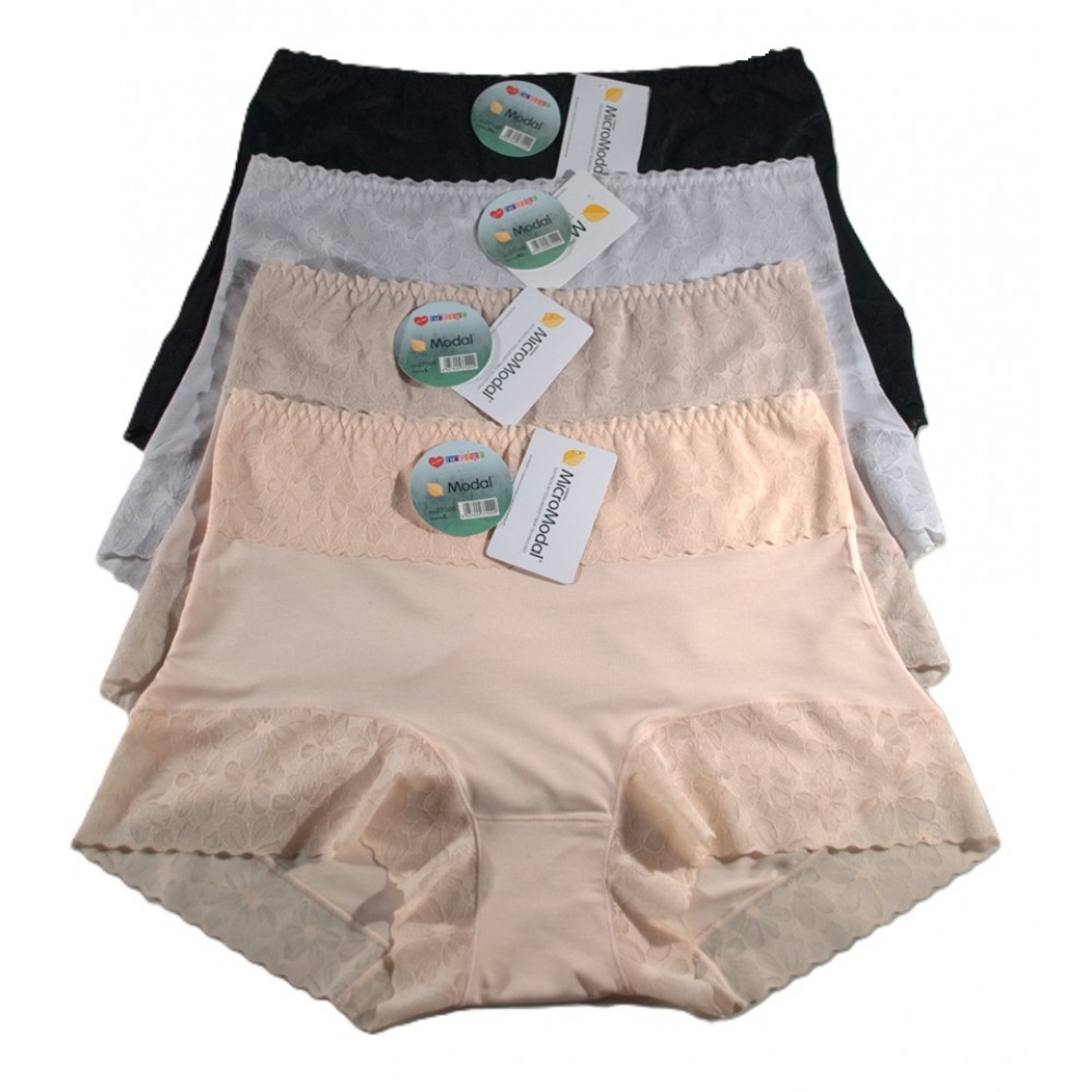 Женские трусики-слипы из высококачественного мягкого модала. Красивые приглушенные цвета, украшенные кружевом. В упаковке 12 цветов. Доступны в разных размерах (L, XL, 2XL). Состав: 94% модал, 6% эластан.