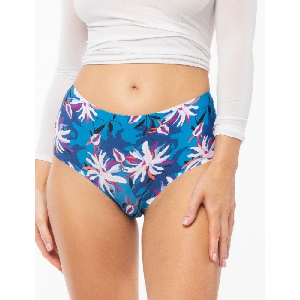 Figi damskie o pełnym, zabudowanym kroju, ozdobione kolorowym wzorem. Laserowo cięte, bezszwowo zakończone. Skład: 89% poliamid, 10% elastan, 1% bawełna.