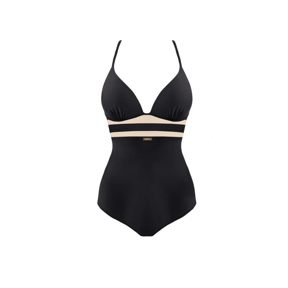 Цельный купальник из гладкой микрофибры. Завязывается на шее, имеет мягкие чашечки с легкой драпировкой и прозрачные вставки под грудью.
