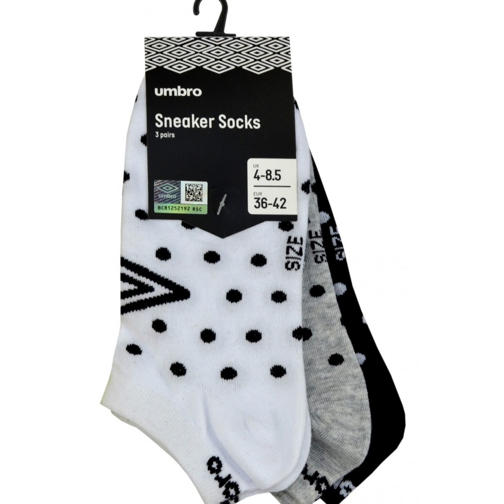 Stopki damskie z delikatnymi kropeczkami i logo UMBRO. Pakowane po trzy pary. Skład surowcowy: 76% bawełna, 22% poliamid, 2% elastan.