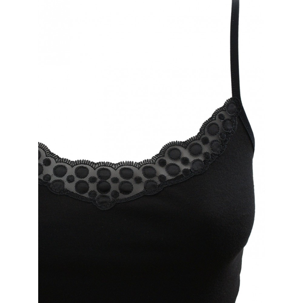Женская майка на узких бретелях из мягкого, приятного на ощупь 100% хлопка. Вырез горловины украшен ..