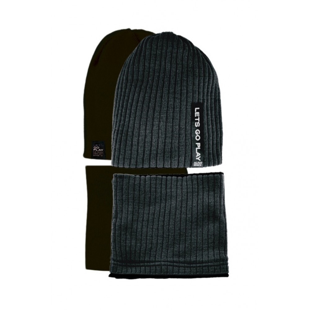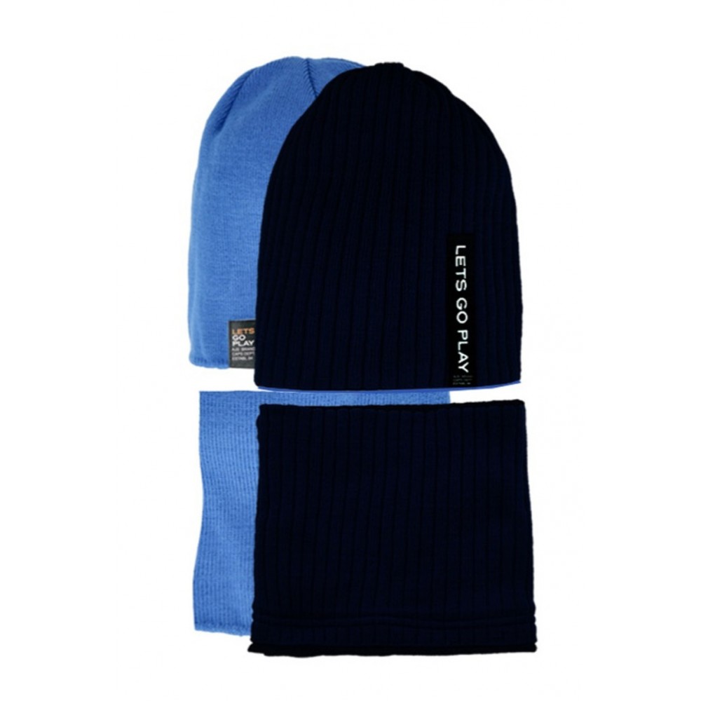Двусторонний комплект для мальчика: шапка с шарфом. Шапка слегка удлинённая, с заплатками по бокам. Шарф гладкий и также двусторонний.