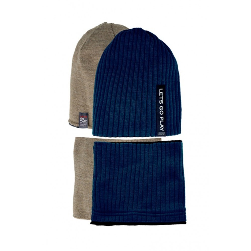 • Двусторонний комплект для мальчика: шапка с шарфом. Шапка слегка удлинённая, с заплатками по бокам. Шарф гладкий и также..