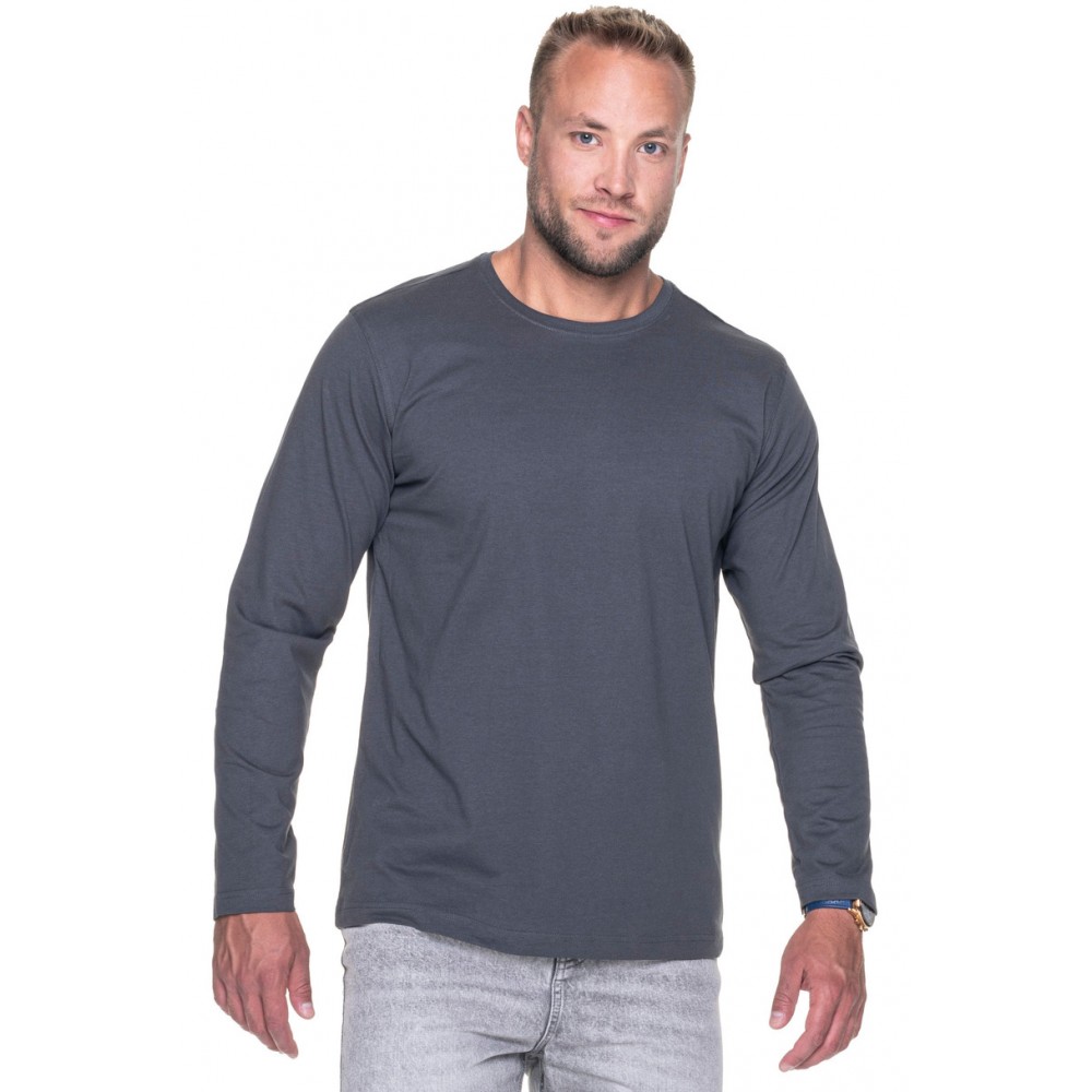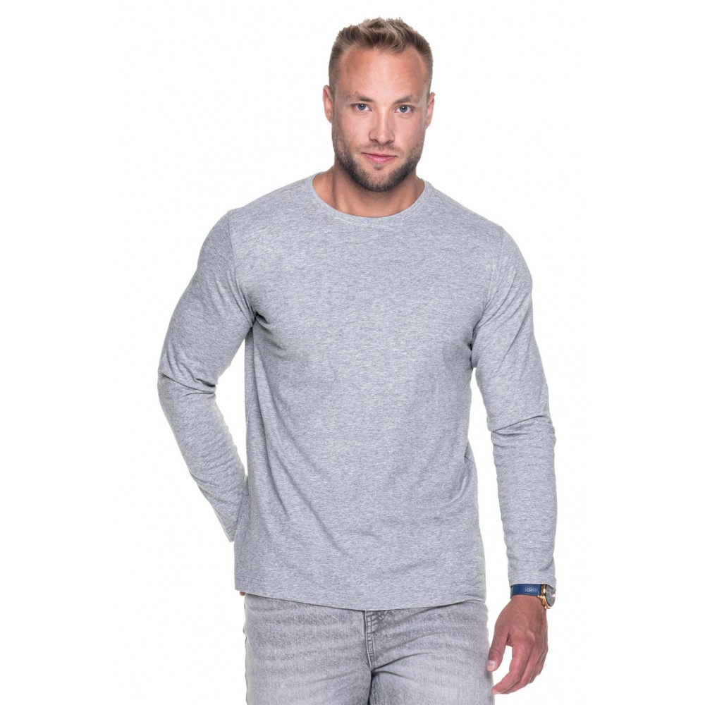 Мужская футболка с длинным рукавом из однотонного трикотажного полотна; классический крой; энзимная стирка для безупречной отделки; материал с силиконовым покрытием для мягкости и приятности на ощупь; горловина отделана двухслойной ребристой манжетой с эластаном для большей прочности; контрастная лента на горловине; плечи с усиливающей и стабилизирующей лентой для повышения прочности швов; боковые швы; двойные плотные швы с использованием ниток высочайшего качества. ПЛОТНОСТЬ: 175 г/м², СОСТАВ: 100% расчесанный хлопок кольцевого прядения; цвет: серый меланж: 90% расчесанный хлопок, 10% вискоза