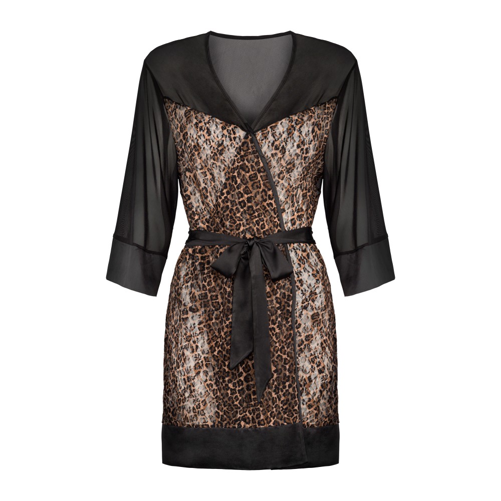 Женский халат Allunes классического кроя глубокого черного цвета в сочетании с элегантным чувственным леопардовым принтом. Тонкий пояс, завязанный на талии, мягко подчеркнет ее, обеспечивая при этом комфорт ношения. Слегка прозрачный материал делает пеньюар Allunes, надетый на обнаженное тело, или чувственный комплект нижнего белья прекрасным дополнением вечернего образа только для двоих. Узнайте больше деталей: интересное сочетание черного цвета и элегантных животных узоров, прозрачный материал на рукавах и спинке, атласная отделка, приятная на ощупь лента на талии, приятные и нежные материалы (90% полиамид, 10% эластан).