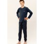 Однотонная пижама для мальчиков с длинными рукавами и нежным принтом на груди. В комплект входят брюки с рисунком и манжетами.