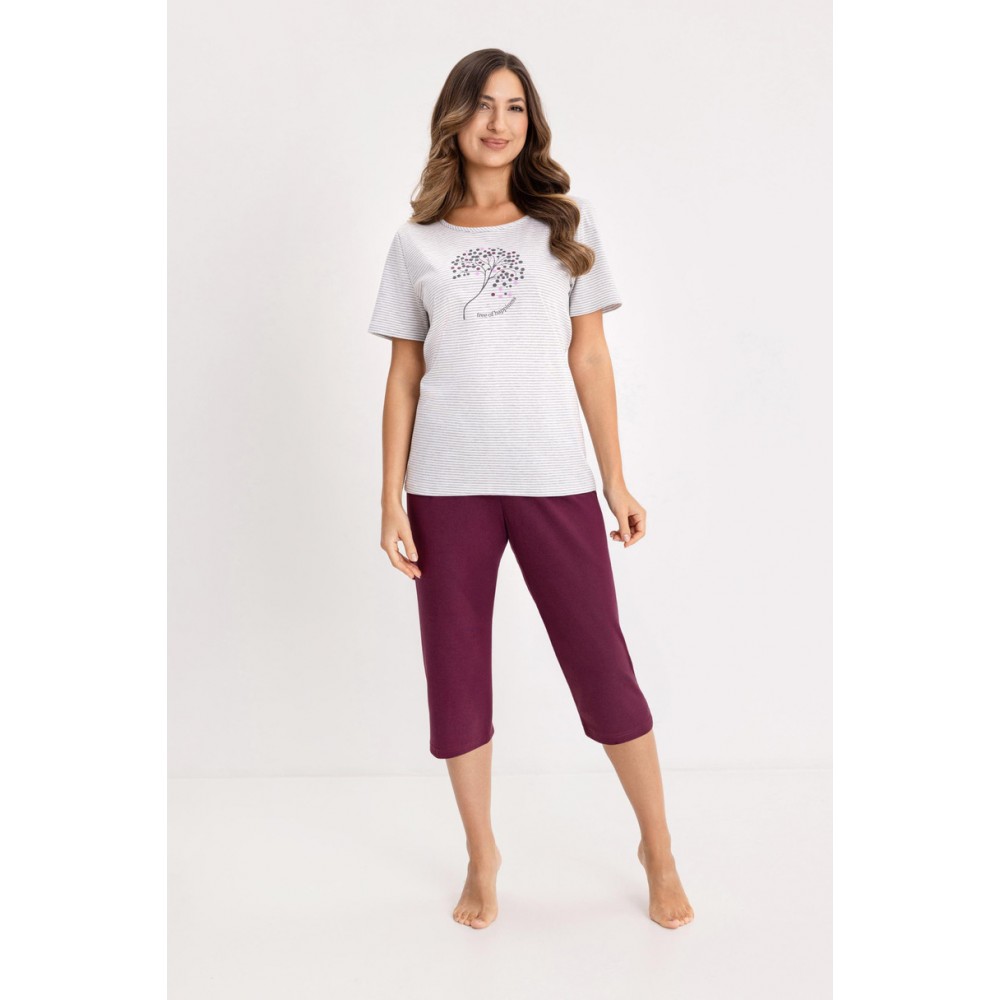 Женская пижама 732 BIG W/26 REGINA — это удобный и стильный комплект для сна, изготовленный из 100% натурального хлопка. Дышащий, мягкий материал обеспечивает комфортный сон и приятные ощущения на коже всю ночь. Полосатая футболка с короткими рукавами и круглым вырезом гарантирует свободу движений, а декоративный принт на передней части добавляет модный, женственный штрих. Однотонные брюки длиной 3/4 идеально дополняют комплект, обеспечивая комфорт и удобство ношения. Это идеальный женский пижамный комплект для сна и отдыха дома в любое время года.