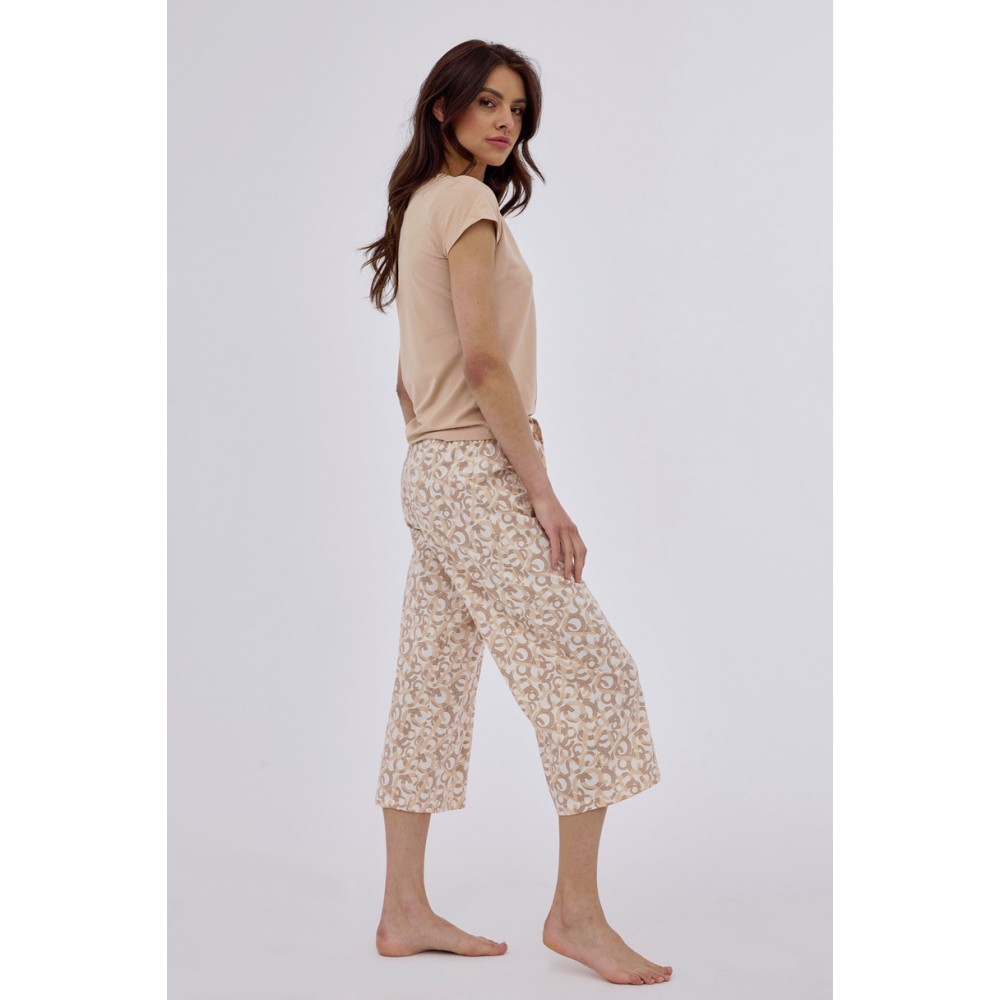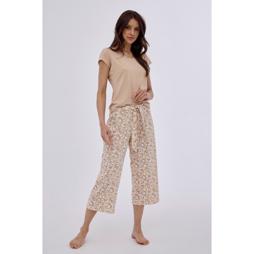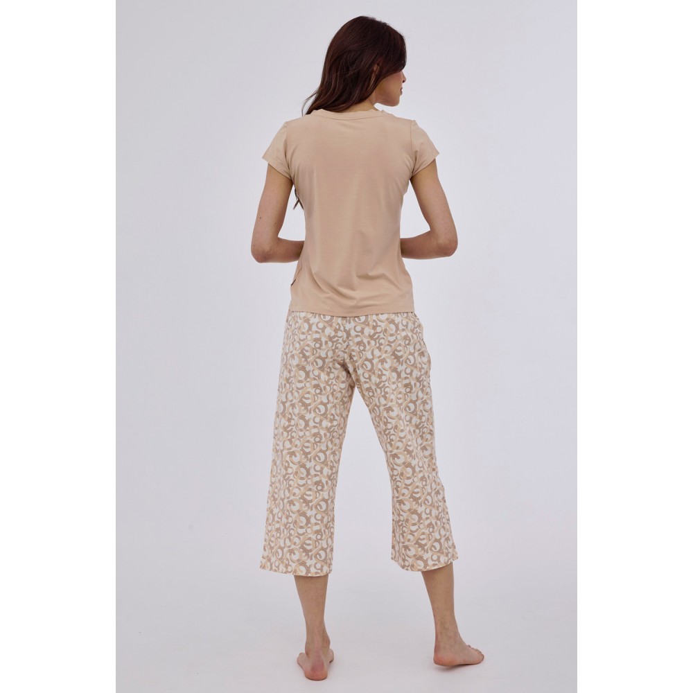 Женская пижама с короткими рукавами из модала с эластаном, с V-образным вырезом. В комплекте с соответствующими брюками длиной 7/8 с широкими штанинами и узором. Упаковано в коробку.