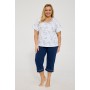Komplet uzupełniają jednolite spodnie o długości 7/8, które zapewniają wygodę i swobodę ruchów. Klasyczny krój sprawia, że piżama doskonale sprawdzi się zarówno podczas snu, jak i w czasie domowego relaksu.