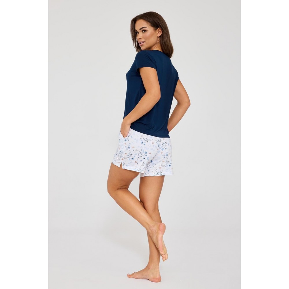 Koszulka z krótkim rękawem oraz dekoltem w szpic subtelnie podkreśla sylwetkę, zapewniając wygodę i swobodę ruchów. Krótkie spodenki w kwiatowy print dodają całości lekkości i letniego charakteru. Nogawki z delikatnymi rozporkami po bokach zwiększają komfort noszenia, a praktyczne kieszenie na biodrach podnoszą funkcjonalność.