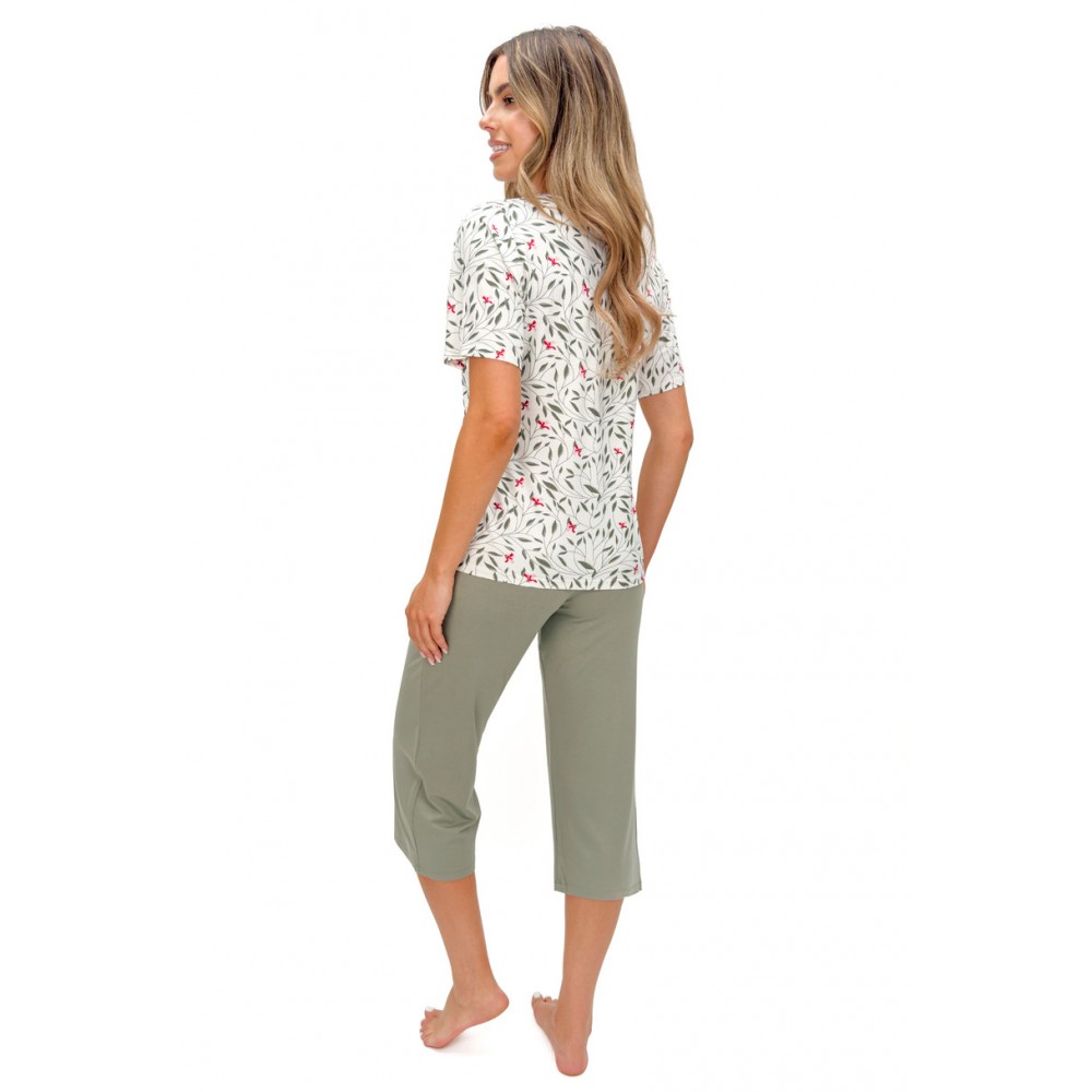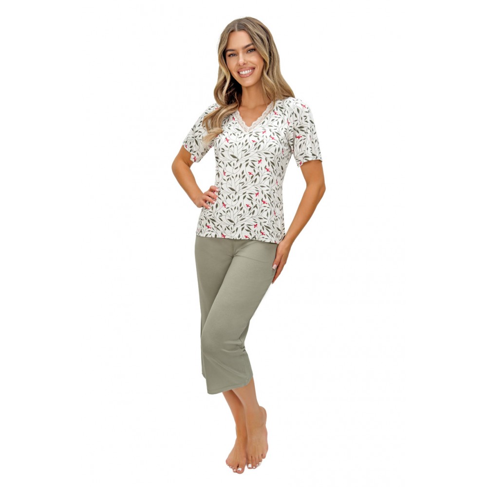 Женская пижама Melisa 3/4 сочетает в себе утонченную элегантность, женственный стиль и исключительный комфорт. Изготовленная из высококачественной вискозы с добавлением эластана, она обеспечивает приятную мягкость и идеальную посадку. Это идеальный выбор для женщин, которые ценят комфорт и домашний уют. Топ с короткими рукавами, украшенный нежным цветочным принтом, выглядит свежо и легко. V-образный вырез отделан тонким ажурным кружевом, добавляя романтичный и элегантный штрих. В комплект входят однотонные брюки длиной 3/4, которые идеально дополняют топ с узором. Эластичный материал гарантирует свободу движений и комфорт во время сна и повседневного отдыха. Доступен в широком диапазоне размеров от S до 2XL, каждая женщина сможет найти идеальный размер. Упаковано в полиэтиленовый пакет.