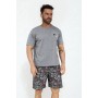 Koszulka z krótkim rękawem posiada klasyczny, półokrągły dekolt, który zapewnia swobodę ruchów i wygodne dopasowanie. Nadruk z przodu nadaje piżamie nowoczesnego, a jednocześnie uniwersalnego charakteru. Krótkie, wzorzyste spodenki tworzą spójny komplet i dodają całości lekkości.
