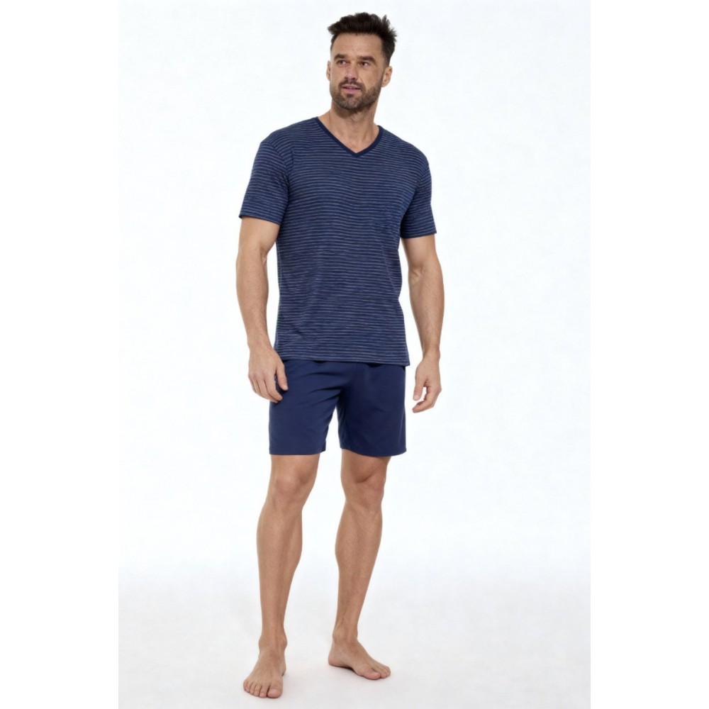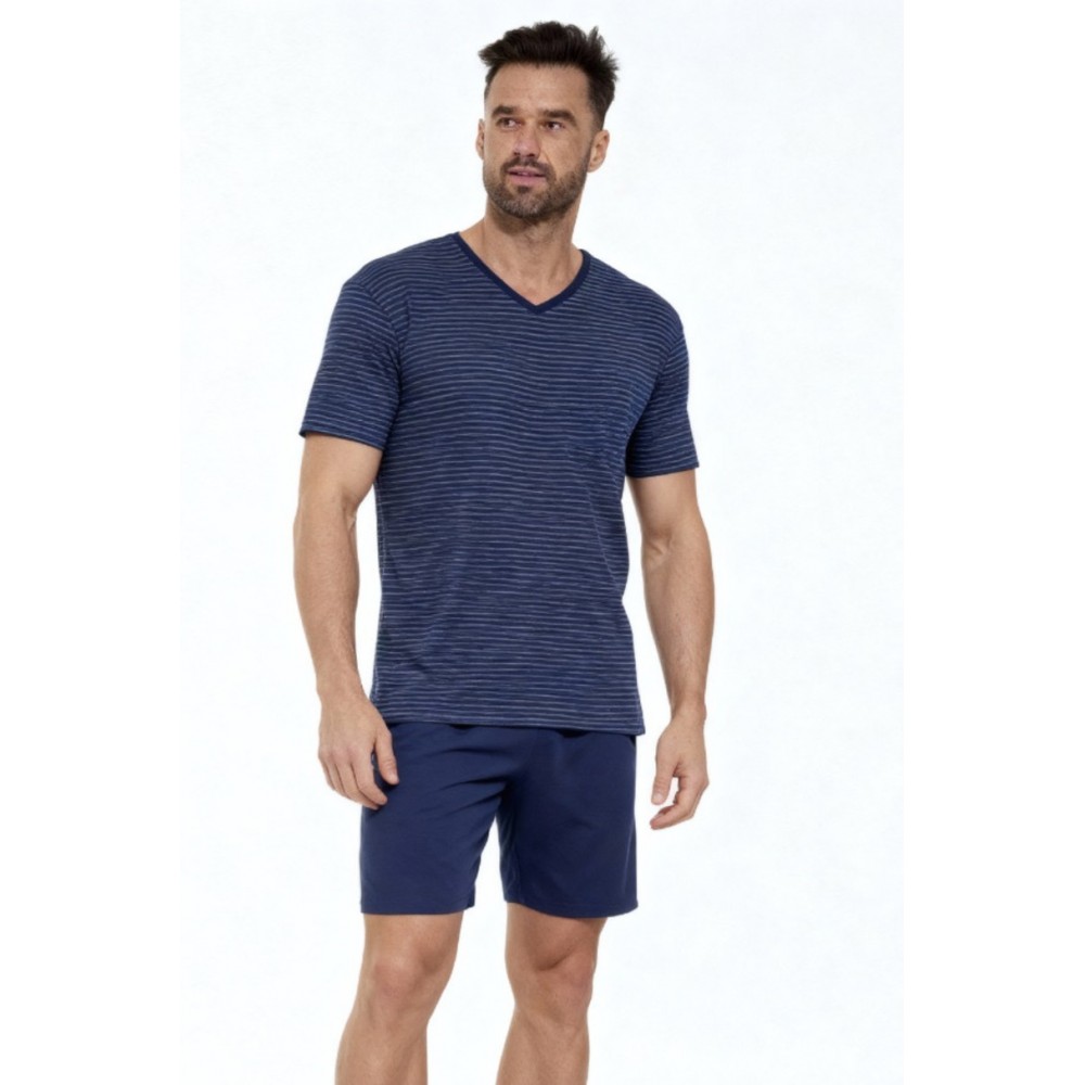 Piżama męska KR 330 W/26 to klasyczna i wygodna propozycja na cieplejsze noce, łącząca ponadczasowy styl z wysokim komfortem noszenia. Koszulka w modne paski z krótkim rękawem oraz dekoltem w szpic nadaje całości elegancki, męski charakter i zapewnia swobodę ruchów. Dzianina bawełniana z dodatkiem poliestru jest miękka, przyjemna dla skóry i bardziej odporna na odkształcenia.