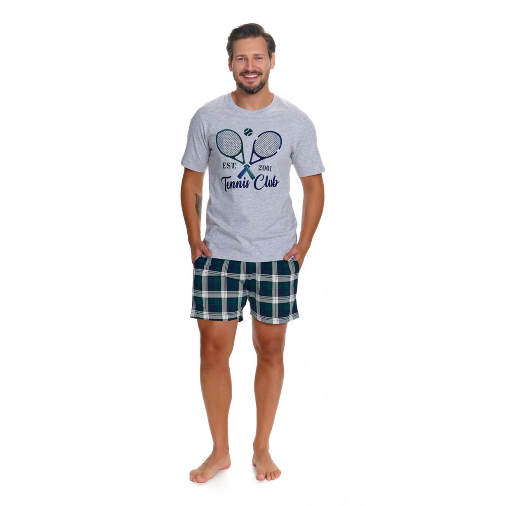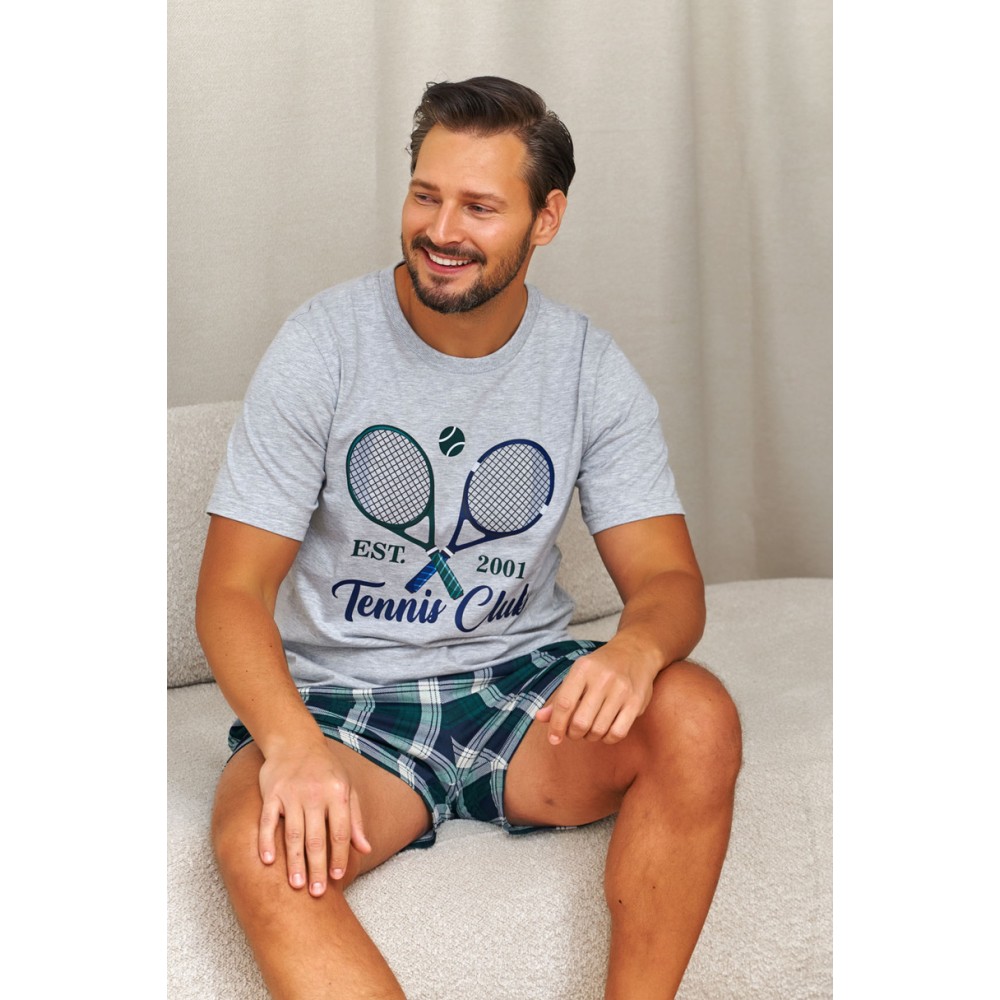Zestaw składa się z koszulki z krótkim rękawem, której przód zdobi kolorowy nadruk, nadający piżamie nowoczesnego i swobodnego charakteru. Do kompletu dołączone są krótkie spodenki w kratę, wyposażone w praktyczne kieszenie, które zwiększają funkcjonalność i wygodę użytkowania. Klasyczny krój zapewnia pełną swobodę ruchów i komfort podczas snu oraz domowego relaksu.