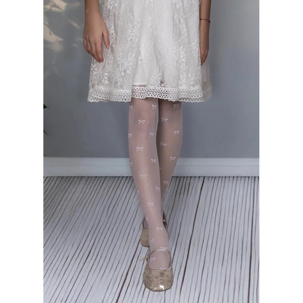 Rajstopy dziewczęce 20 Den ozdobione subtelnym wzorem w kokardki. Dzięki wysokiej jakości przędzy są trwałe i estetyczne, dobrze dopasowują się do nóg dziecka. Lekkie i przewiewne, zapewniają komfort noszenia. Skład: 88% poliamid, 11% elastan, 1% bawełna.