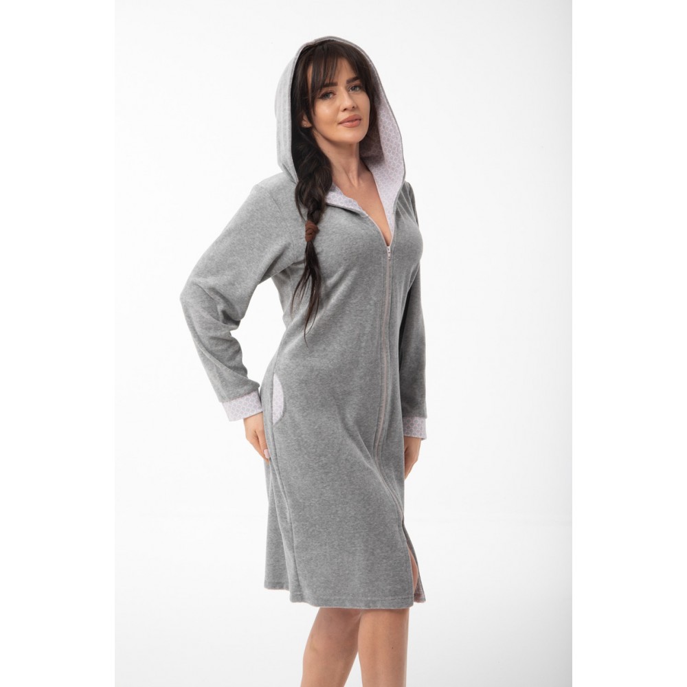 Kaptur oraz rękawy wykończone zostały kontrastującym materiałem, co nadaje modelowi nowoczesnego i sportowego charakteru. Na wysokości bioder znajdują się praktyczne kieszenie, zwiększające funkcjonalność szlafroka. FR-373 Dorota to idealny wybór jako szlafrok po kąpieli, wygodny strój domowy lub ciepłe okrycie na chłodniejsze poranki.