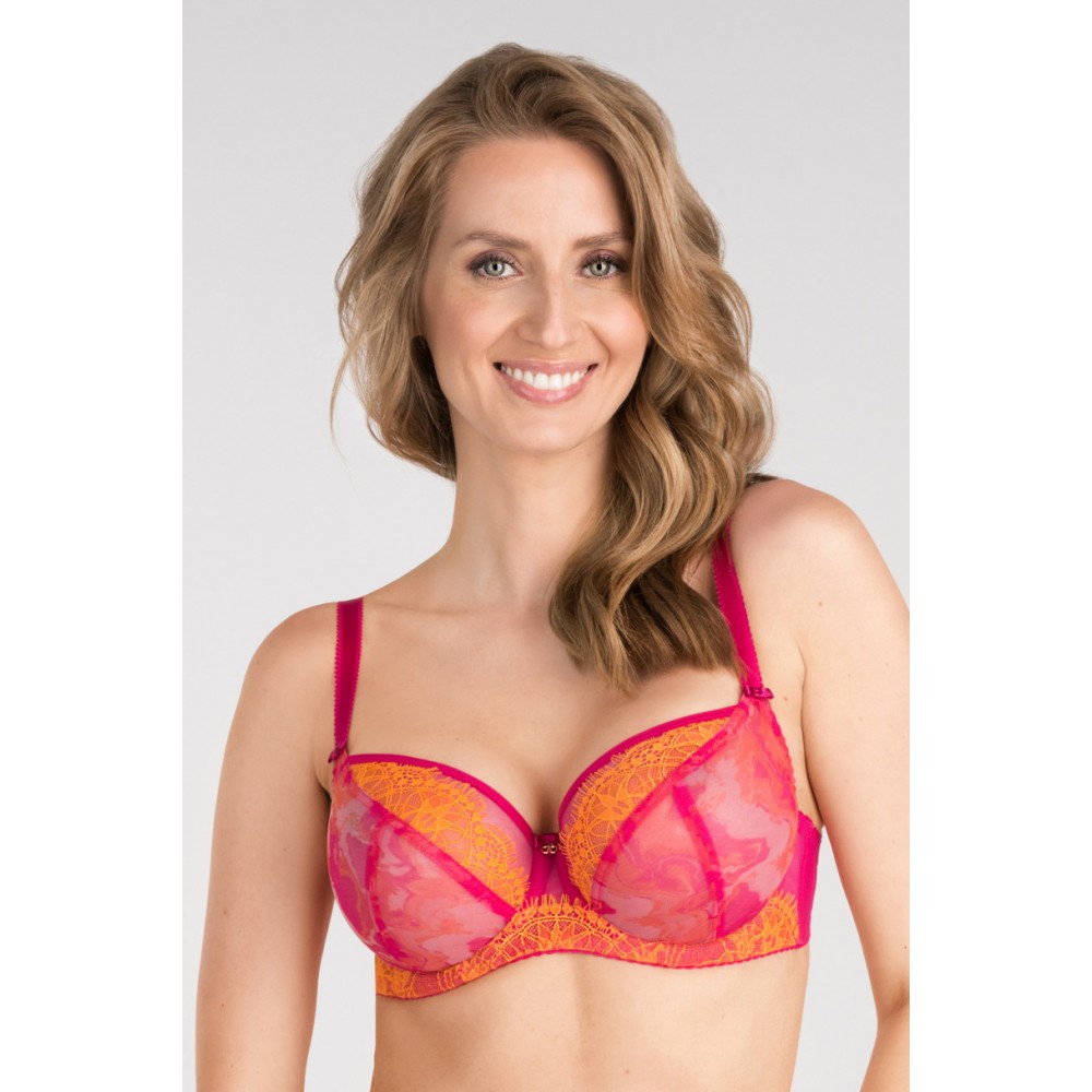 М'який бюстгальтер, розроблений для жінок із середніми та великими грудьми. Забезпечує ефект дуже сильного підйому та збору бюста до центру. Чашки з трьох частин, виготовлені з тюлю, нанесеного на стійкий фатин. Спереду, боки та верхня частина чашок зі стійким мереживом контрастного кольору. Спинка з прозорої лайкри забезпечує дуже хорошу посадку та підтримку. Бічні кісточки запобігають скочуванню матеріалу, залежно від розміру, два або три ряди гачків з трьома ступенями Регулювання окружності Невідстібаються, регульовані лямки трьох ширини Металеві елементи кольору рожеве золото
