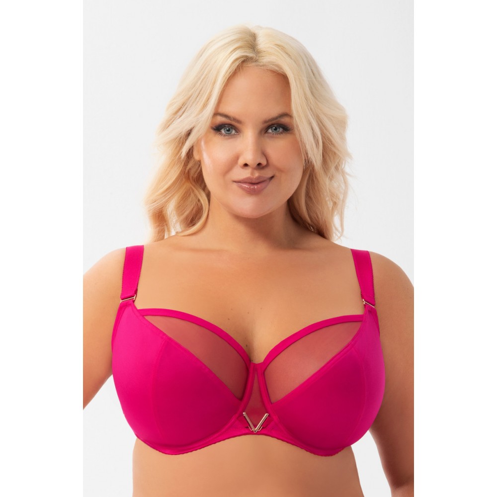 М'який бюстгальтер призначений для жінок із середніми, великими та дуже великими грудьми. Забезпечує ефект дуже сильного підйому і збирання бюста всередину. Забезпечує ефект дуже сильного підйому і збирання бюста всередину, чашки 3 предмета з обшивального симплексного трикотажу і стійкого фатину. Верхній край чашки і пахва оброблені широкою гумкою. Металевий декоративний елемент у формі літери V на перемичці Для підвищення комфорту використання бюстгальтер оброблений широкою м'якою гумкою на спині. Бічні кісточки запобігають згортанню матеріалу. Залежно від розміру дво- або трирядні гачки з триступеневою регулюванням окружності. Невідстібні регульовані лямки трьох ширин, додатково укріплені оксамитовою стрічкою великих розмірів. Металеві елементи зі світлого золота (без нікелю) Склад: 90% поліамід, 7% еластан, 3% поліестер