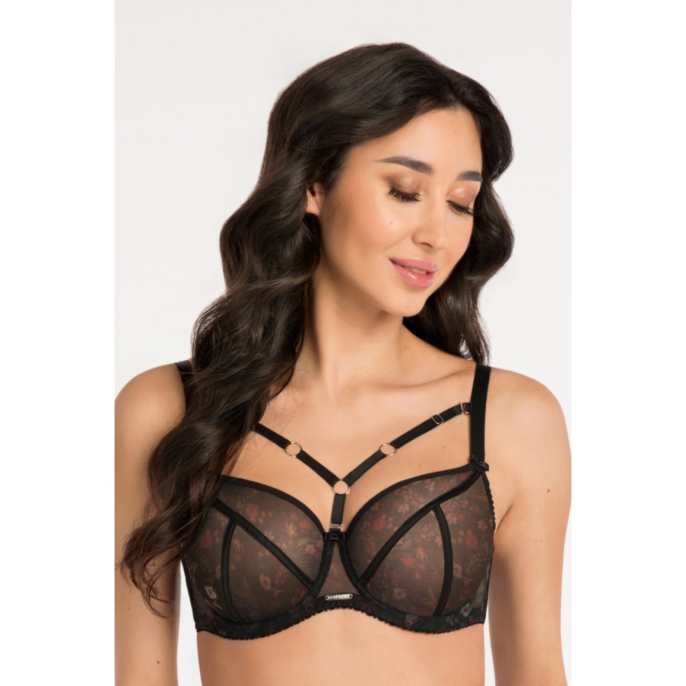 М'який бюстгальтер, призначений для жінок із середніми, великими та дуже великими грудьми, забезпечує ефект дуже сильного підйому та збору бюста, повністю з принтованої тюлі. Шви на чашках обтягнуті атласною стрічкою. Знімні регульовані бретелі по вирізу. Спинка з прозорої лайкри забезпечує дуже хорошу посадку та підтримку. Бічні кісточки запобігають згортанню матеріалу, в залежності від розміру, два або три ряди гачків з триступеневою регулюванням окружності. Невідстібні регульовані лямки трьох розмірів сріблястого кольору. Склад: 90% поліамід, 7% еластан, 3% поліестер