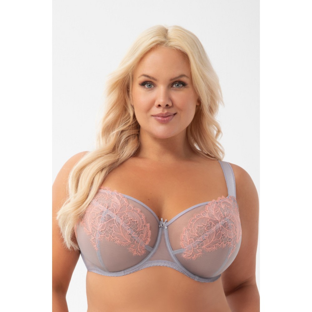 М'який бюстгальтер призначений для жінок із середньо-великими та дуже великими грудьми. Забезпечує ефект сильного підйому і збирання бюста всередину, чашки з 3 предметів з вишивки на стійкому фатині. Верхній край чашки оброблений тасьмою, плавно переходить на лямку, забезпечуючи кращу підтримку бюсту. Спинка з прозорої лайкри забезпечує дуже хорошу посадку та підтримку. Бічні кісточки запобігають згортанню матеріалу. Залежно від розміру дво- або трирядні гачки з триступеневою регулюванням окружності. Невідстібні регульовані лямки трьох ширин, додатково укріплені оксамитовою стрічкою великих розмірів. Срібні металеві елементи (без нікелю) Склад: 90% поліамід, 7% еластан, 3% поліестер