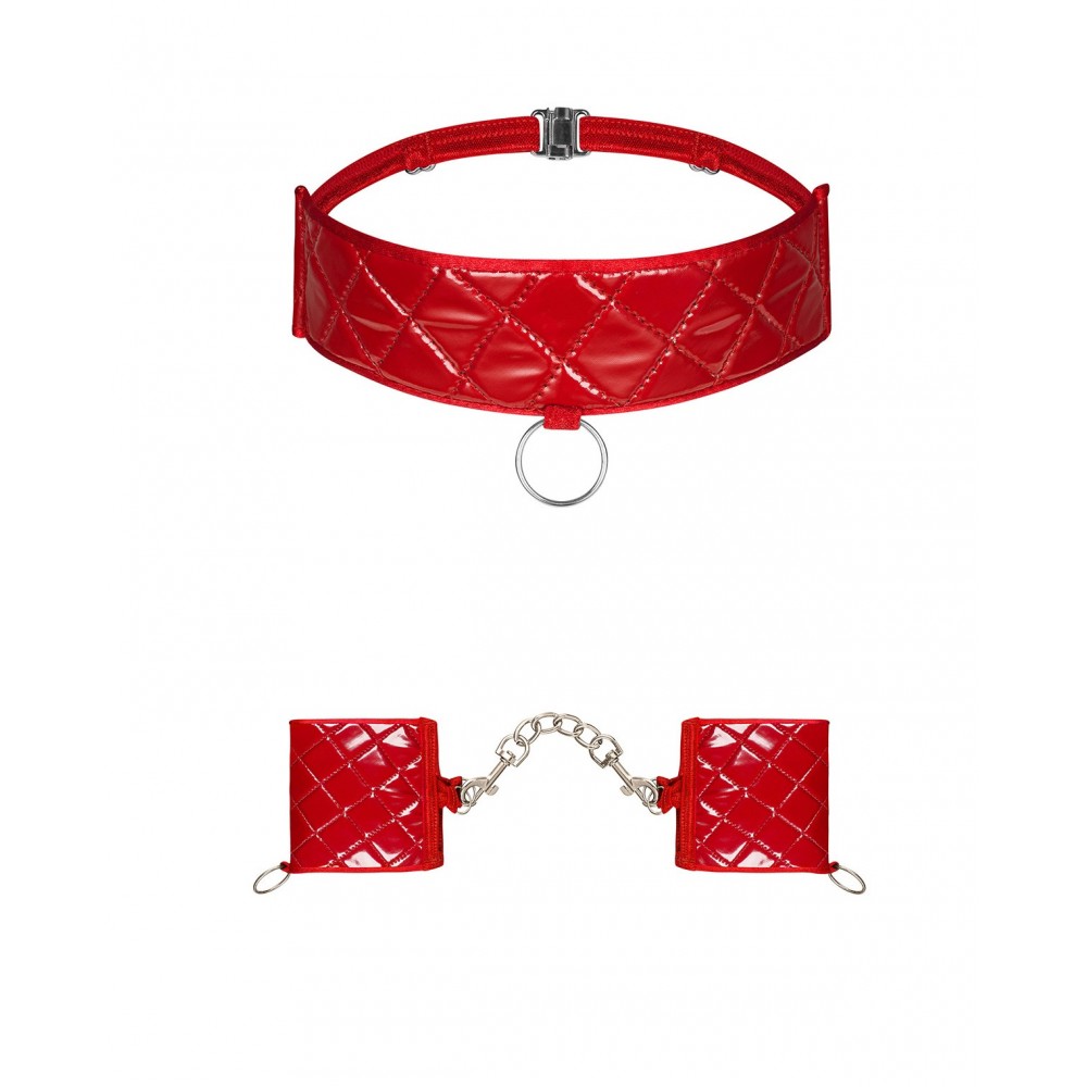 Komplet damski. W skład zestawu wchodzą: czerwone kajdanki i regulowana opaska na szyję. Choker i kajdanki zdobione srebrnymi kółeczkami, kajdanki połączone za pomocą odpinanego łańcuszka. Skład: 45% poliuretan, 45% poliamid, 10% elastan.