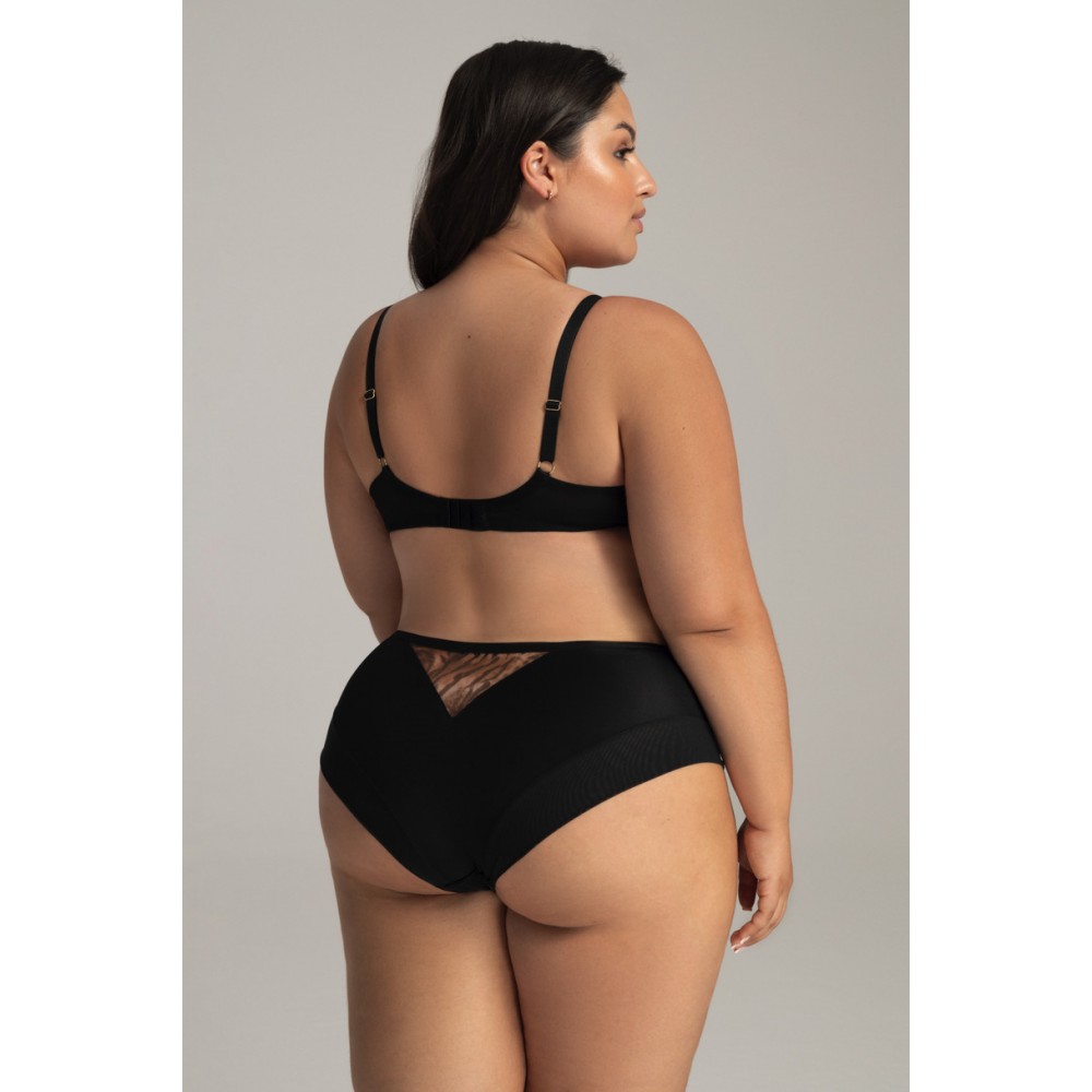 Темпераментна Ліана чуттєво огортає тіло. Напівприталені чашечки AV 2143, підтримані бежевим поролоном, покритим чорним тюлем, стримають навіть найнеслухняніший бюст завдяки своїй неперевершеній конструкції. Золота вишивка на тлі плямистого принта прикрашає спокусливі вигини підкреслених грудей. Кокетливе віконце, підкреслене золотим колом, що повторюється на бретельках, додає Ліані нотку пишноти. Ретельно підібрані бретельки та широка стрічка фіксують бюстгальтер, а привабливі трусики та бразиліана, пошиті з ніжних тканин, доповнюють чуттєвий ансамбль.