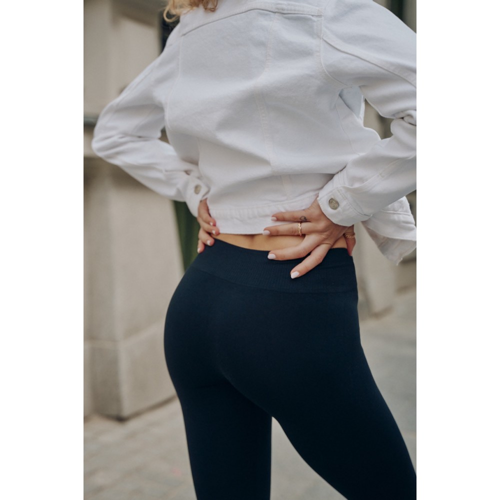 Чорні непрозорі легінси з високою талією щільно облягають талію, візуально роблячи її плоскішою та підтримуючи живіт. Приталені легінси не збираються та не мнуться, а еластичний пояс забезпечує комфорт і тримає легінси з високою талією на місці. Безшовні легінси не обмежують рухів, створюючи ефект другої шкіри.