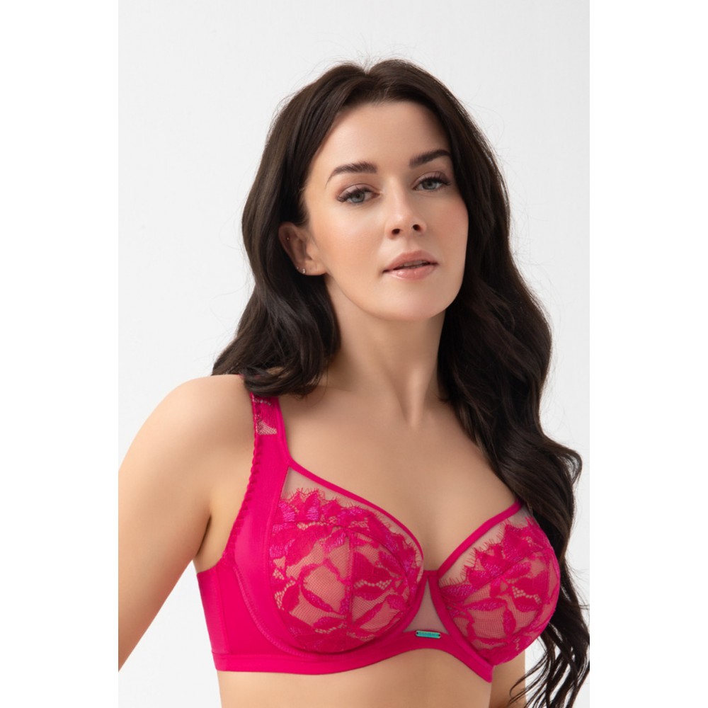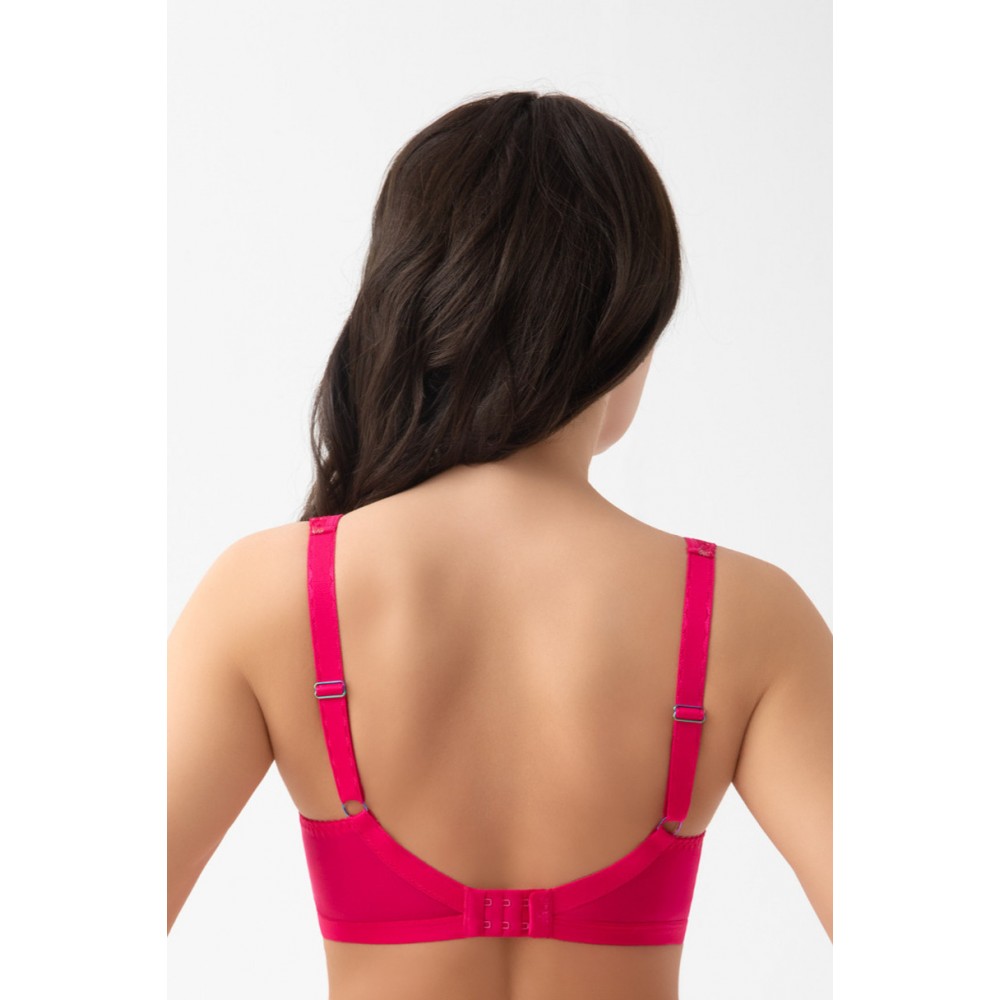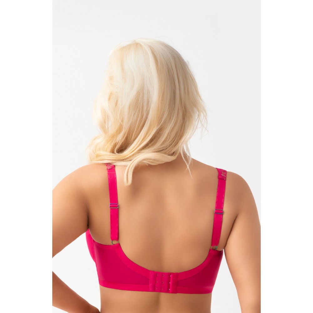 G029 AMARIS (konstrukcja K638 VENEZIA) Biustonosz miękki przeznaczony dla kobiet ze średnim oraz dużym biustem. Miski wykonane z tiulu stabilnego oraz połyskującej koronki, natomiast panel boczny z kryjącej dzianiny typu simplex. Dolna krawędź pasa obwodu została wykończona miękkimi lamówkami, co znacząco podnosi komfort noszenia. Model wyróżnia się zastosowaniem szerokich ramiączek z pianki i koronki, których zadaniem jest odciążenie ramion i kręgosłupa. Tył wykonany z kryjącej lycry zapewnia stabilne podtrzymanie, a fiszbiny boczne zapobiegają zwijaniu się materiału. Haftki są obleczone mikrofibrą i posiadają trójstopniową regulację obwodu (dwu- lub trzyrzędowe w zależności od rozmiaru). Nieodpinane, regulowane ramiączka występują w dwóch szerokościach (18,22). Metalowe elementy multicolor nie zawierają niklu – ozdobny element z nazwą marki.