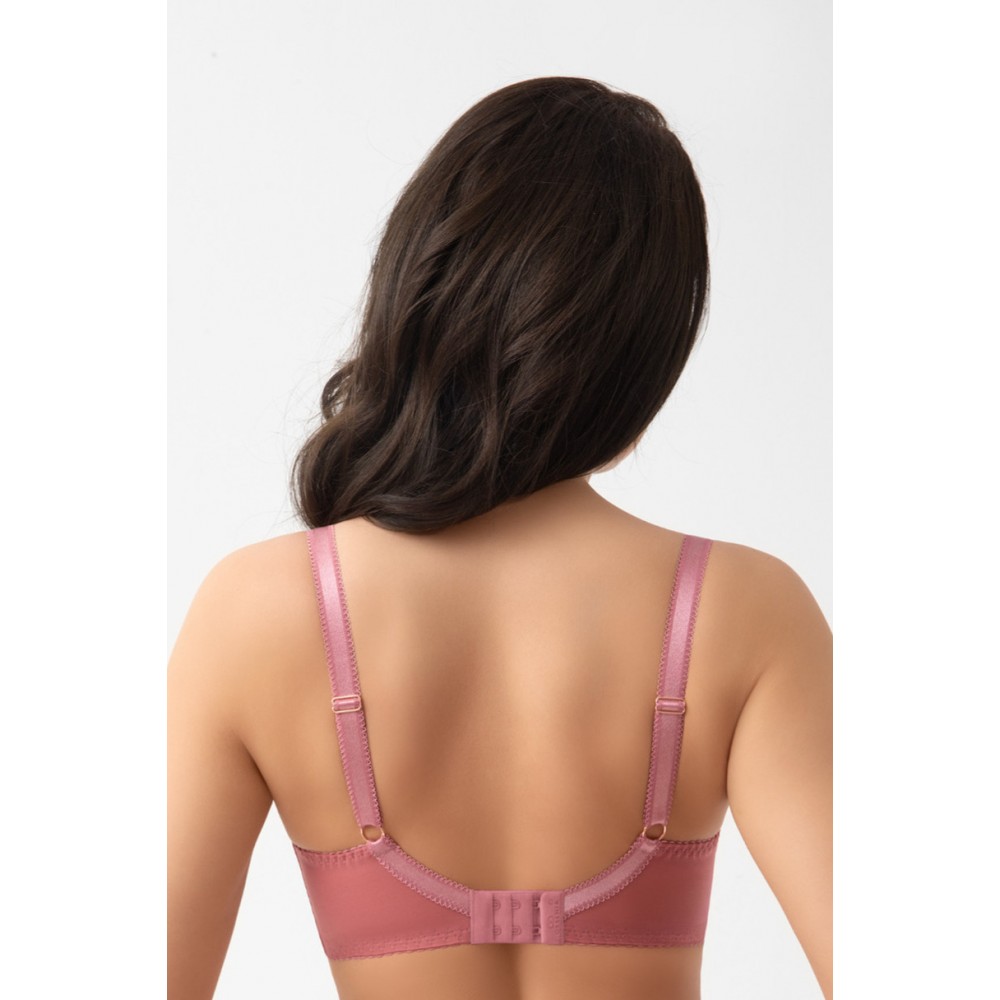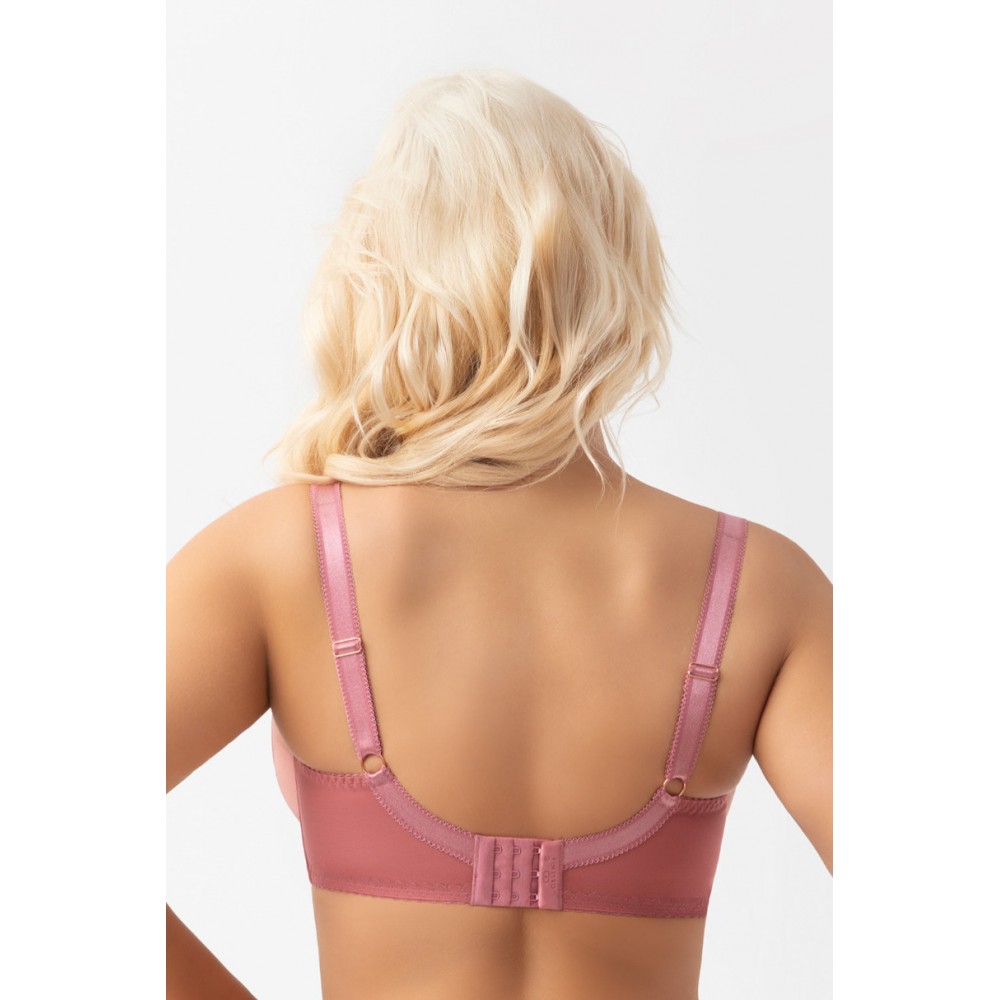 G028 ELORA (konstrukcja K496 PARADISE) Biustonosz miękki przeznaczony dla kobiet ze średnim, dużym oraz bardzo dużym biustem. Dzięki 3-częściowemu podziałowi misek oraz ramiączkom odsuniętym do boku, konstrukcja zapewnia efekt bardzo mocnego uniesienia i zebrania biustu do środka. Miski zostały wykonane z tiulu stabilnego oraz haftu z drukiem. Tył wykonany z lycry gwarantuje stabilność i bardzo dobre podtrzymanie. Model posiada fiszbiny boczne zapobiegające zwijaniu się materiału. W zależności od rozmiaru zastosowano dwu- lub trzyrzędową haftkę obleczoną mikrofibrą z trójstopniową regulacją obwodu. Nieodpinane, regulowane ramiączka występują w trzech szerokościach (14,18,22) a w większych rozmiarach są dodatkowo wzmocnione welurową taśmą dla poprawy komfortu. Metalowe elementy w kolorze rose gold nie zawierają niklu – zdobina - biżuteria przy kokardce w kształcie gorsetu (motyw marki).