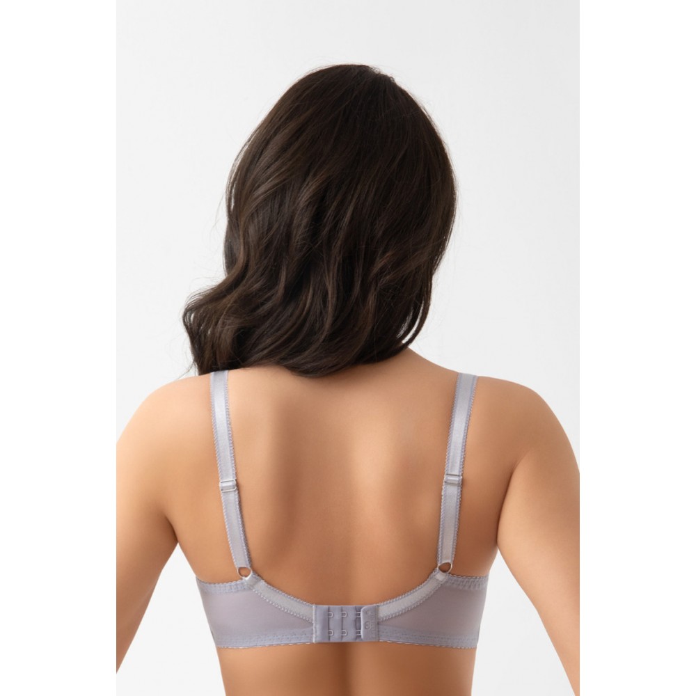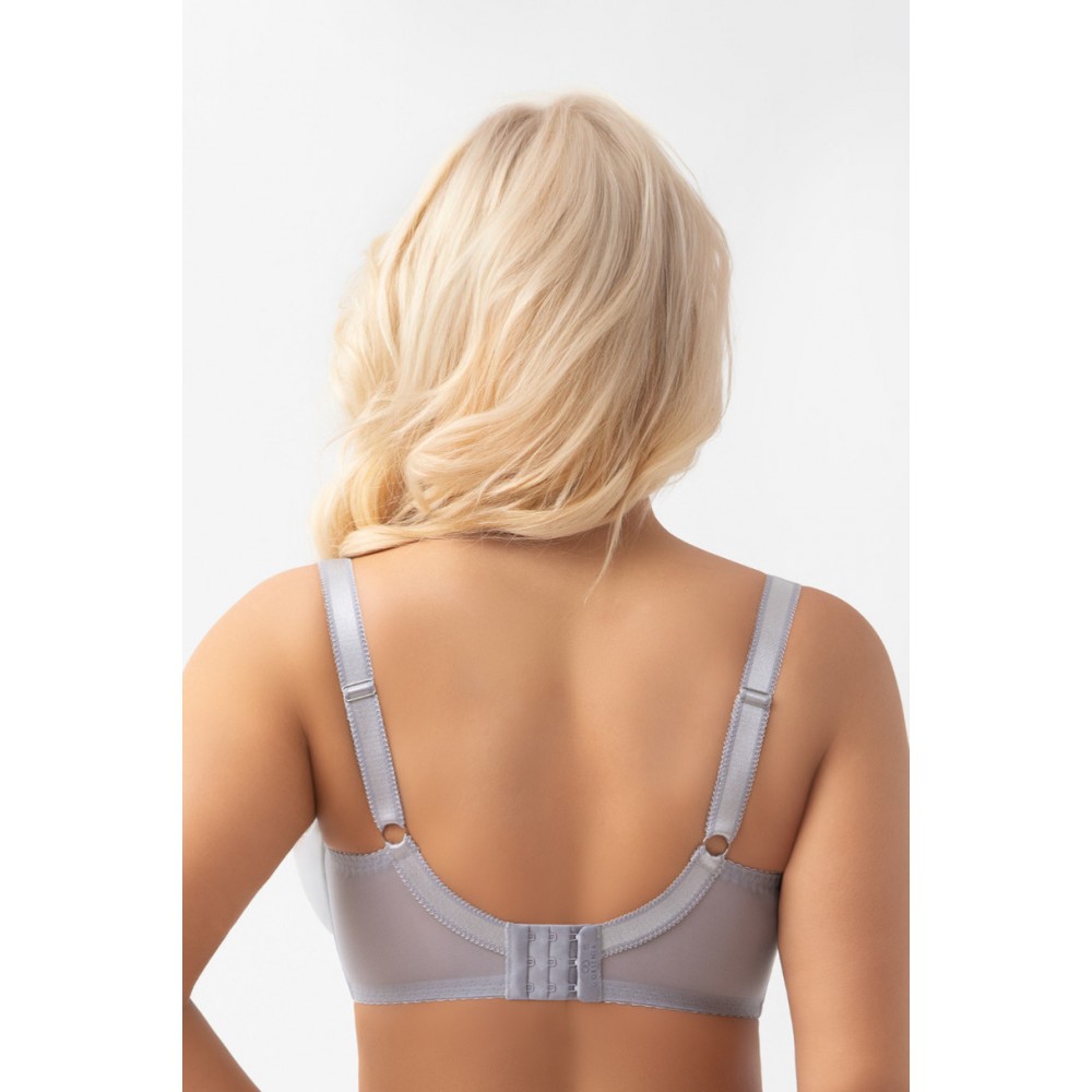 G023 ELSA (konstrukcja K496 PARADISE) Biustonosz miękki przeznaczony dla kobiet ze średnim, dużym oraz bardzo dużym biustem. Dzięki 3-częściowemu podziałowi misek oraz ramiączkom odsuniętym do boku zapewnia efekt bardzo mocnego uniesienia i zebrania biustu do środka. Miski wykonane z tiulu stabilnego oraz efektownego haftu z lureksem. Konstrukcja posiada podwyższony mostek, co gwarantuje stabilność i komfort. Tył wykonany z lycry zapewnia bardzo dobre dopasowanie i podtrzymanie. Fiszbiny boczne zapobiegają zwijaniu się materiału. W zależności od rozmiaru zastosowano dwu- lub trzyrzędową haftkę obleczoną mikrofibrą z trójstopniową regulacją obwodu. Nieodpinane, regulowane ramiączka występują w trzech szerokościach (14, 18, 22), a w większych rozmiarach są dodatkowo wzmocnione welurową taśmą dla poprawy komfortu użytkowania. Metalowe elementy w kolorze silver bez niklu – ozdoba przy kokardce w motywie płatka śniegu.