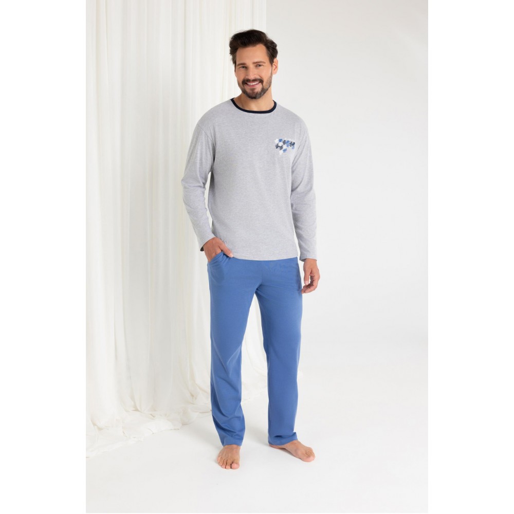 Забезпечте собі комфортний сон та стильний вигляд навіть вдома з цією чоловічою бавовняною піжамою, модель 484 J/25. Комплект включає футболку з довгими рукавами, круглим вирізом горловини та стриманим принтом на грудях, що надає всьому образу сучасного вигляду. Довгі однотонні штани в тон гарантують комфорт та свободу рухів. Виготовлена зі 100% м’якої, дихаючої бавовни, вона ідеально підходить для будь-якої пори року – як для сну, так і як зручний одяг для дому.