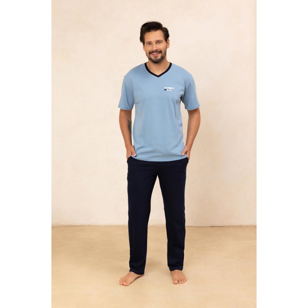 Чоловіча піжама 498 J/25 – це класичний та зручний варіант для чоловіків, які цінують комфорт і стиль. Виготовлена зі 100% високоякісної бавовни, вона забезпечує повну повітропроникність та комфорт під час сну. Футболка з короткими рукавами та V-подібним вирізом ідеально сидить та гарантує свободу рухів. Ненав'язливий принт на грудях додає сучасного вигляду. Довгі, однотонні штани прямого крою доповнюють образ. Ідеально підходять для теплих ночей та як зручний одяг для дому.