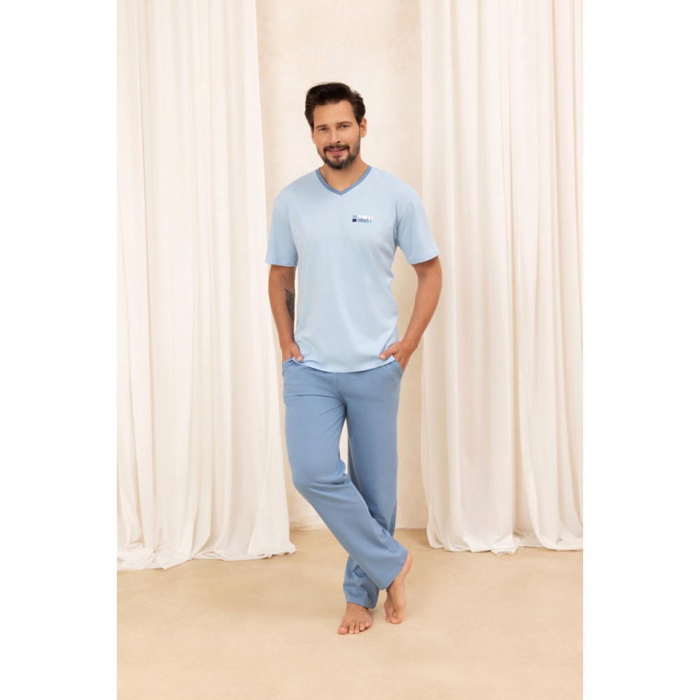 Чоловіча піжама 498 BIG J/25 – це класичний та зручний варіант для чоловіків, які цінують комфорт і стиль. Виготовлена зі 100% високоякісної бавовни, вона забезпечує повну повітропроникність та комфорт під час сну. Футболка з короткими рукавами та V-подібним вирізом ідеально сидить та гарантує свободу рухів. Ненав'язливий принт на грудях додає сучасного вигляду. Довгі, однотонні штани прямого крою доповнюють образ. Ідеально підходять для теплих ночей та як зручний одяг для дому.