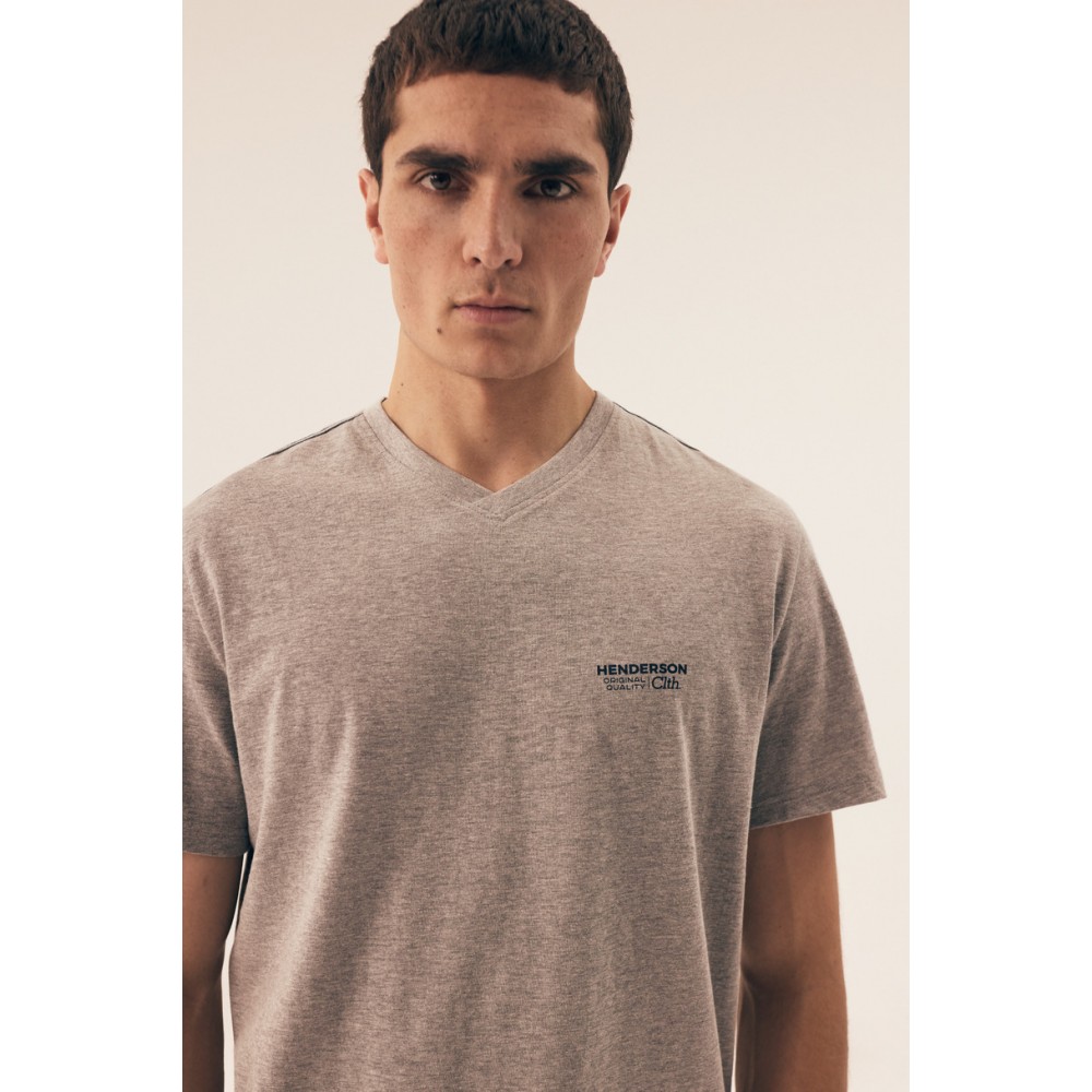 • Чоловіча бавовняна піжама, топ з меланжевого трикотажу. V-подібний виріз, короткі рукави та дрібний принт спереду. Штани..