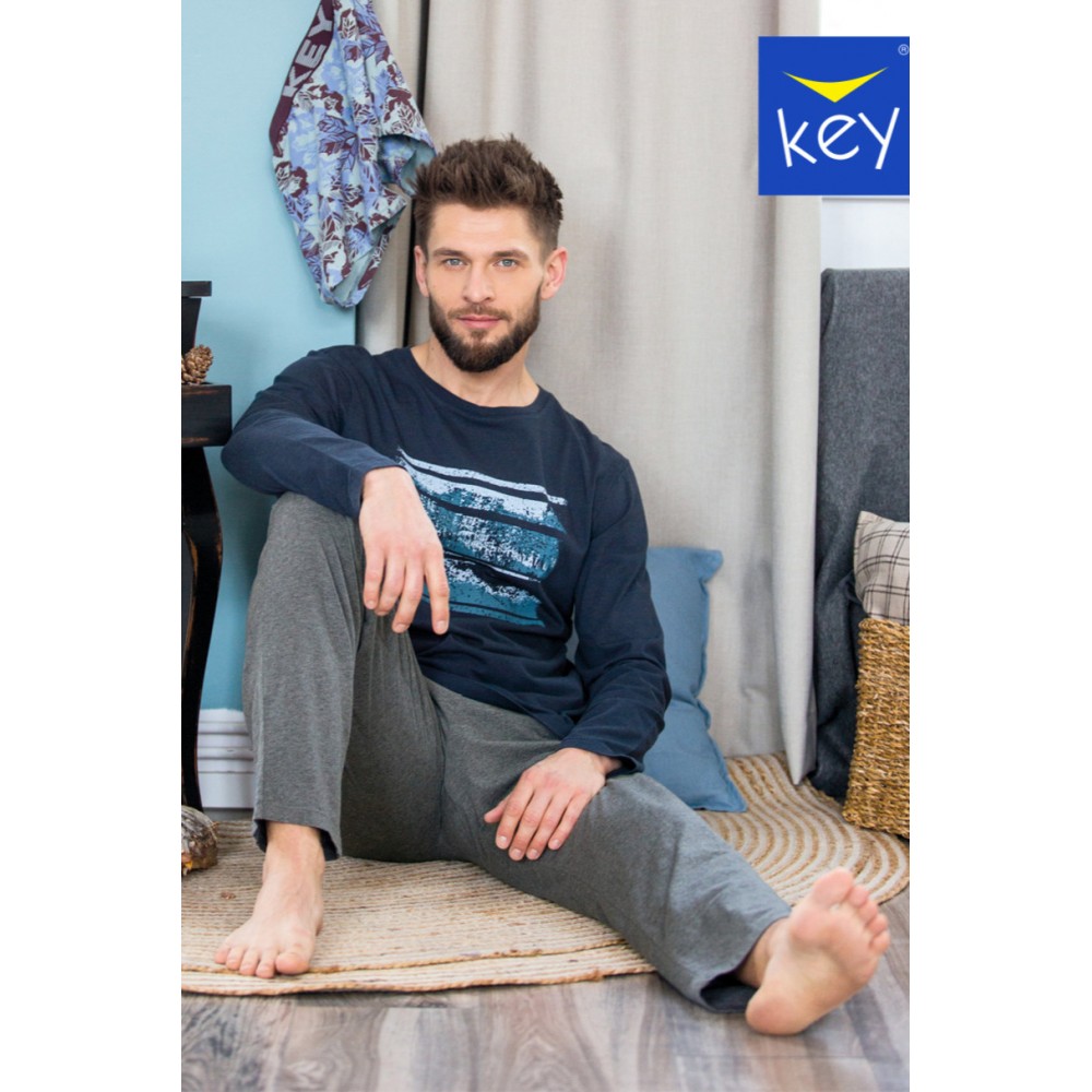 Чоловіча бавовняна піжама. Темно-синя футболка з довгими рукавами, вересово-сірі штани. Склад: 95% бавовна, 5% еластан.