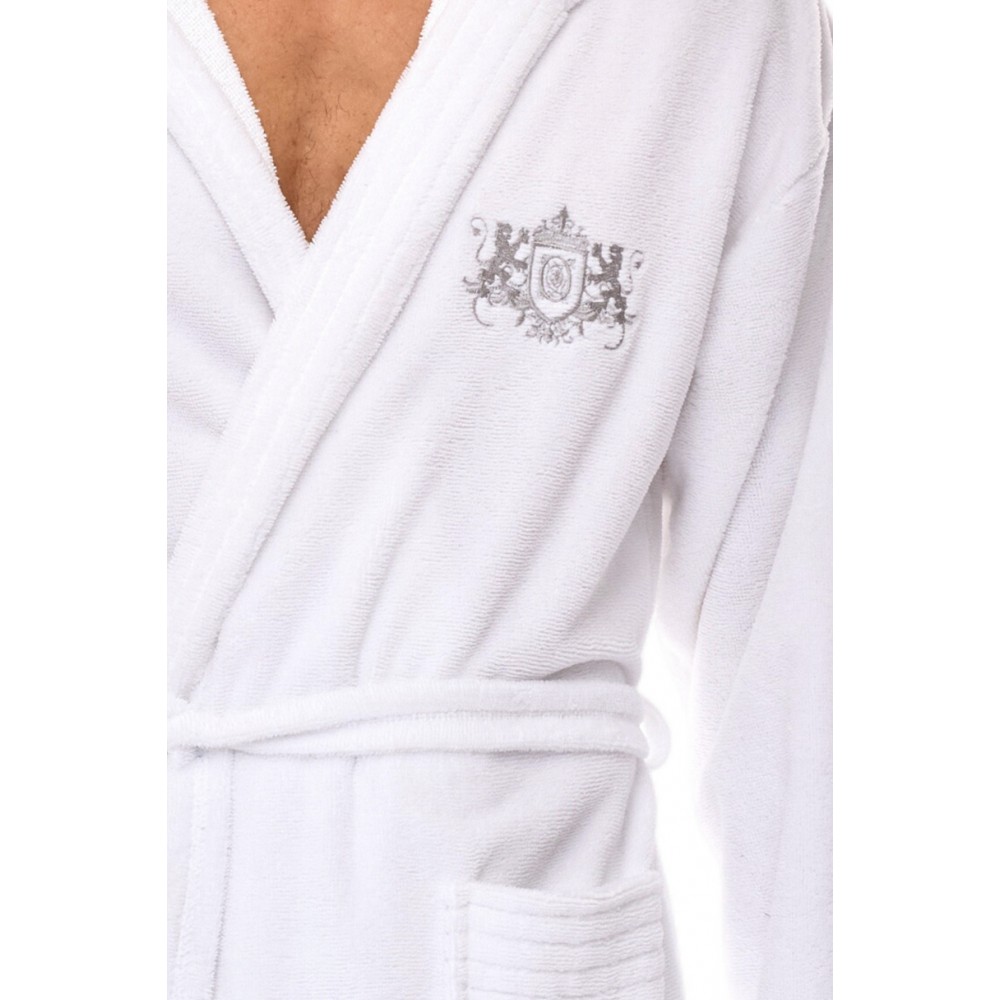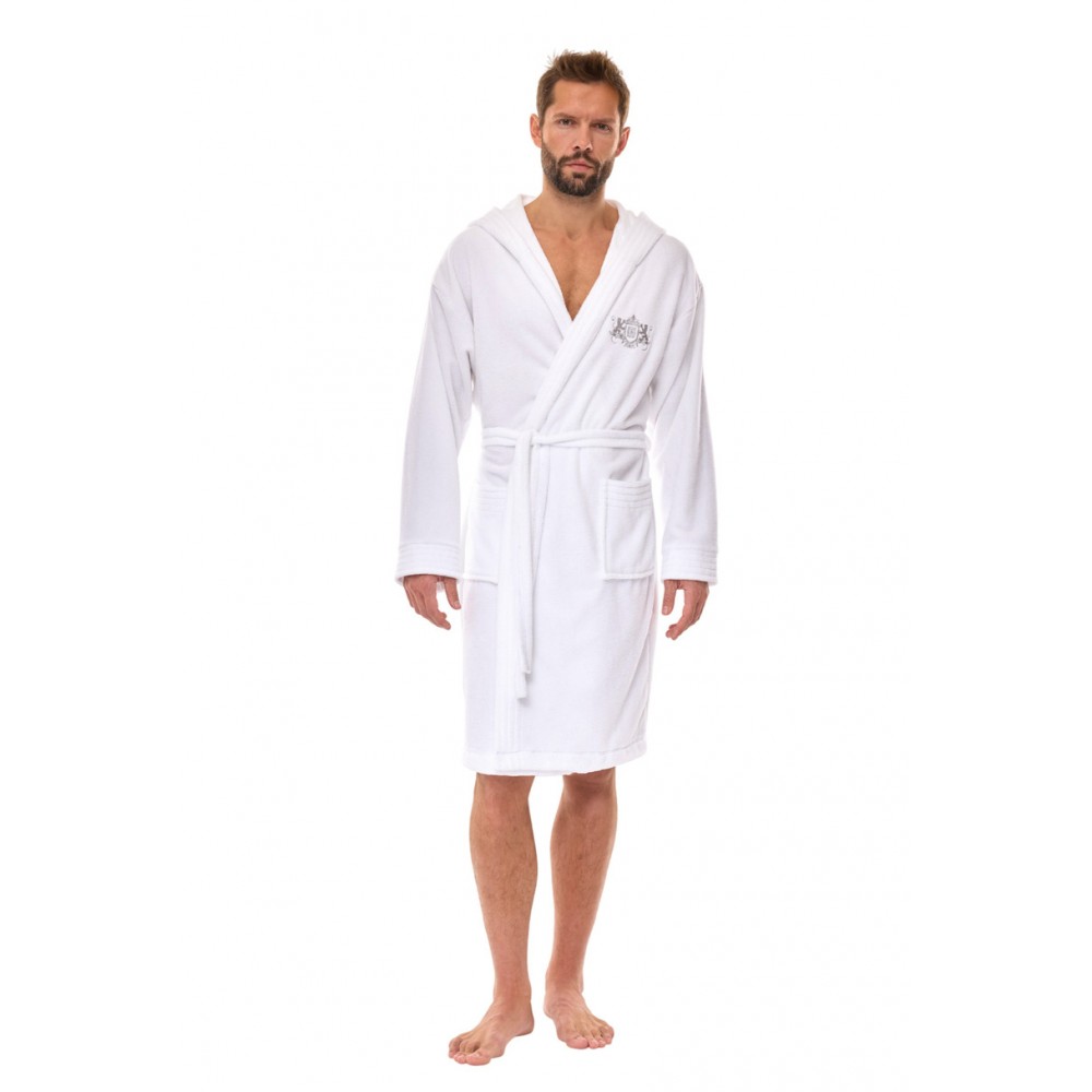 Чоловічий халат 2521 поєднує в собі елегантність, комфорт та сучасні матеріали. Виготовлений з високоякісної суміші бамбука та бавовни, він пропонує виняткову м'якість, повітропроникність та природні антибактеріальні властивості. Його капюшон та практичні кишені забезпечують комфорт, а класична довжина до колін робить його ідеальним як для ванни, так і для відпочинку вдома. Витончений вишитий логотип додає розкішного шарму. Доступний у класичному білому та елегантному темно-синьому кольорах.