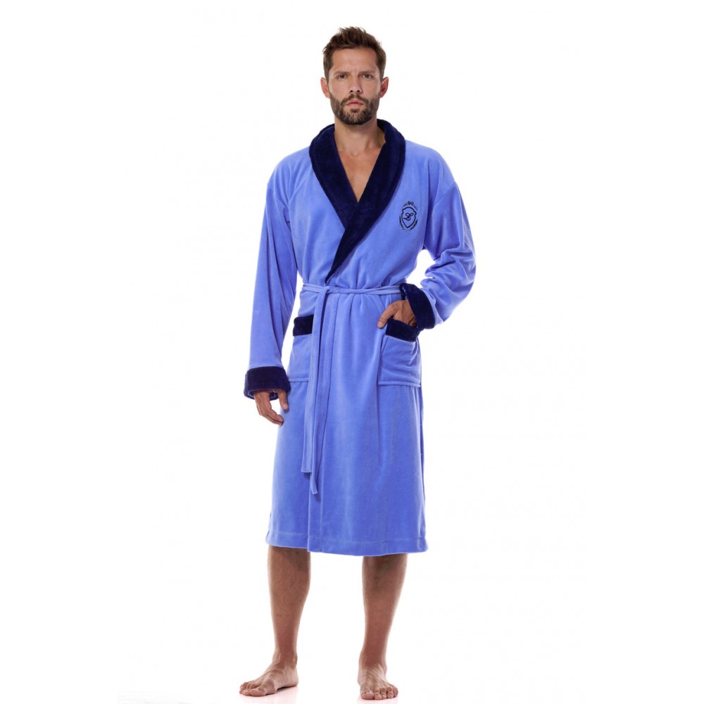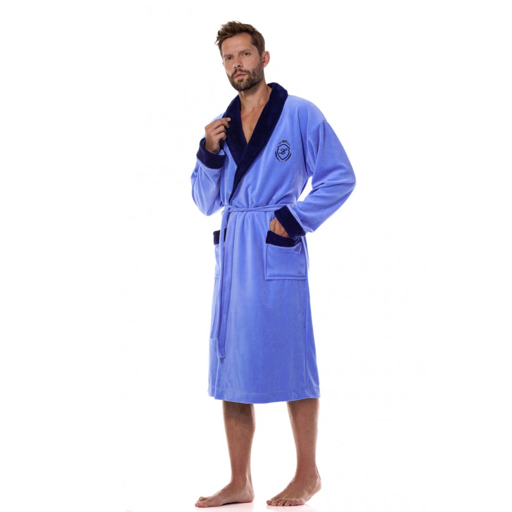 Чоловічий халат, зав'язаний на талії, виготовлений з м'якої тканини, з контрастним шалевим коміром. Декоративна вишивка на грудях та кишені на рівні стегон.