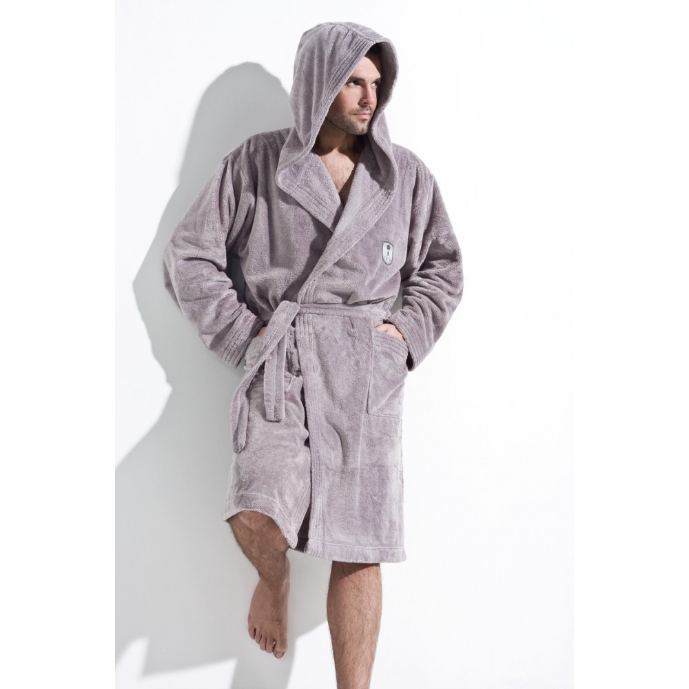 Чоловічий халат з капюшоном, що зав'язується на талії, виготовлений з м'якої трикотажної тканини, кишенями на стегнах та пришитою аплікацією на рівні грудей.