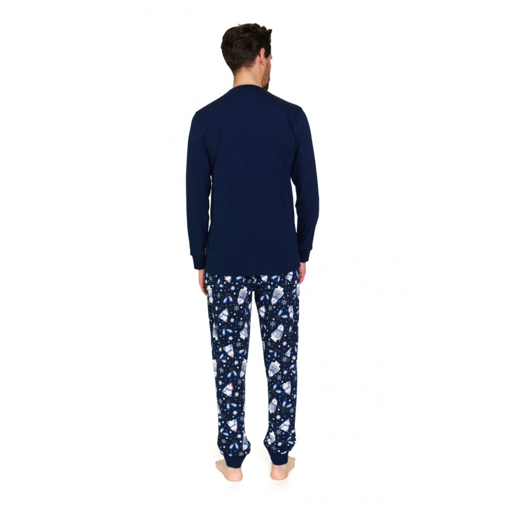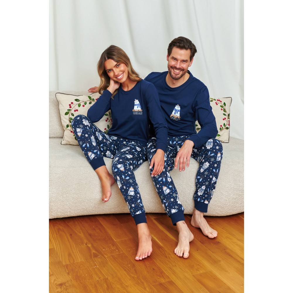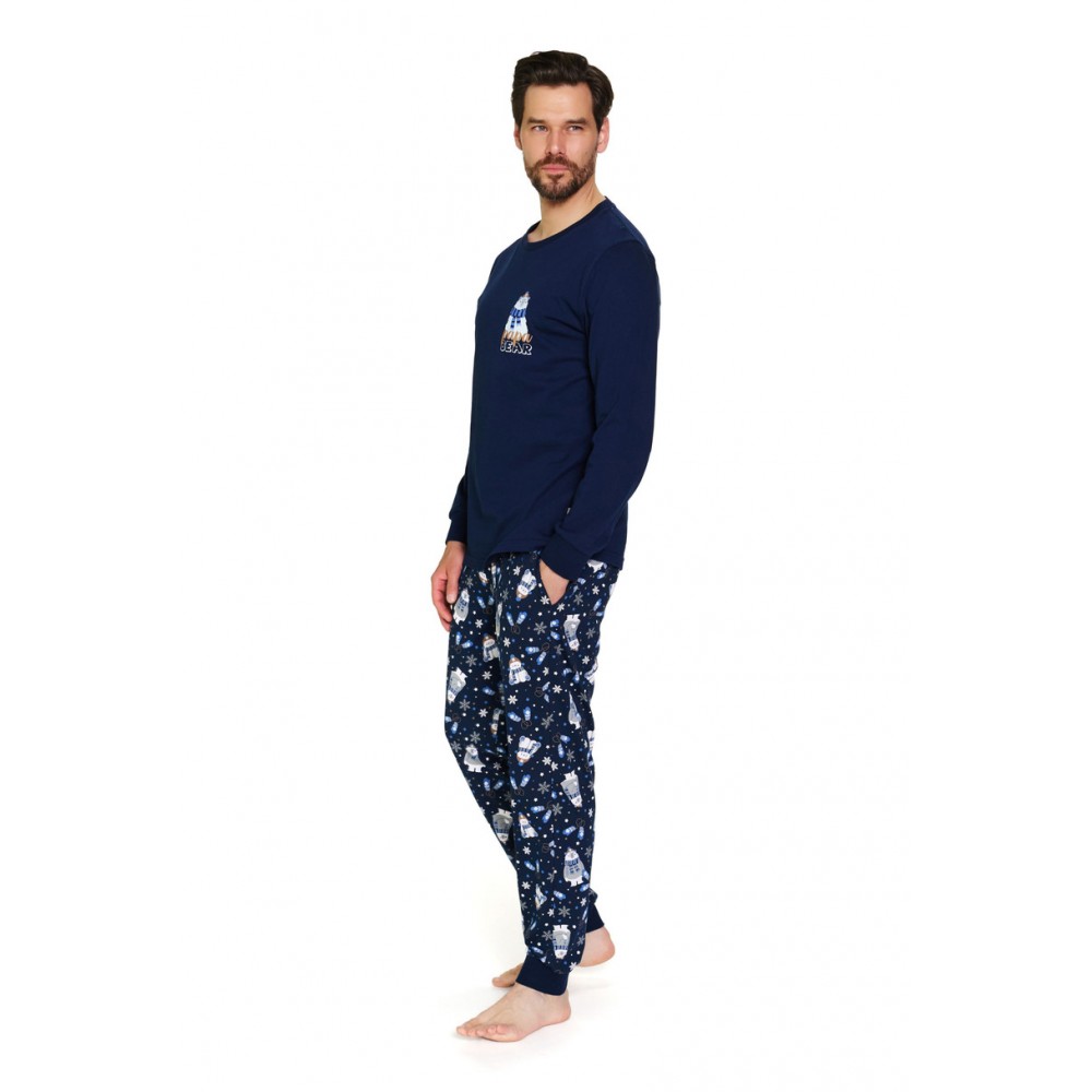 Piżama męska Doctor Nap PM.7338 Cozy Bear BIG to połączenie klasyki, komfortu i nowoczesnego designu. Uszyta w 100% z wysokiej jakości, miękkiej bawełny, zapewnia wygodę oraz przewiewność przez całą noc. Koszulka z długim rękawem w odcieniach granatu i niebieskiego ozdobiona została zabawnym nadrukiem w misie, który nadaje jej oryginalnego charakteru. Do kompletu dołączone są długie spodnie z praktycznymi kieszeniami, dzięki czemu piżama jest nie tylko wygodna, ale i funkcjonalna. Klasyczny krój gwarantuje swobodę ruchów i świetnie sprawdzi się zarówno do spania, jak i domowego relaksu.