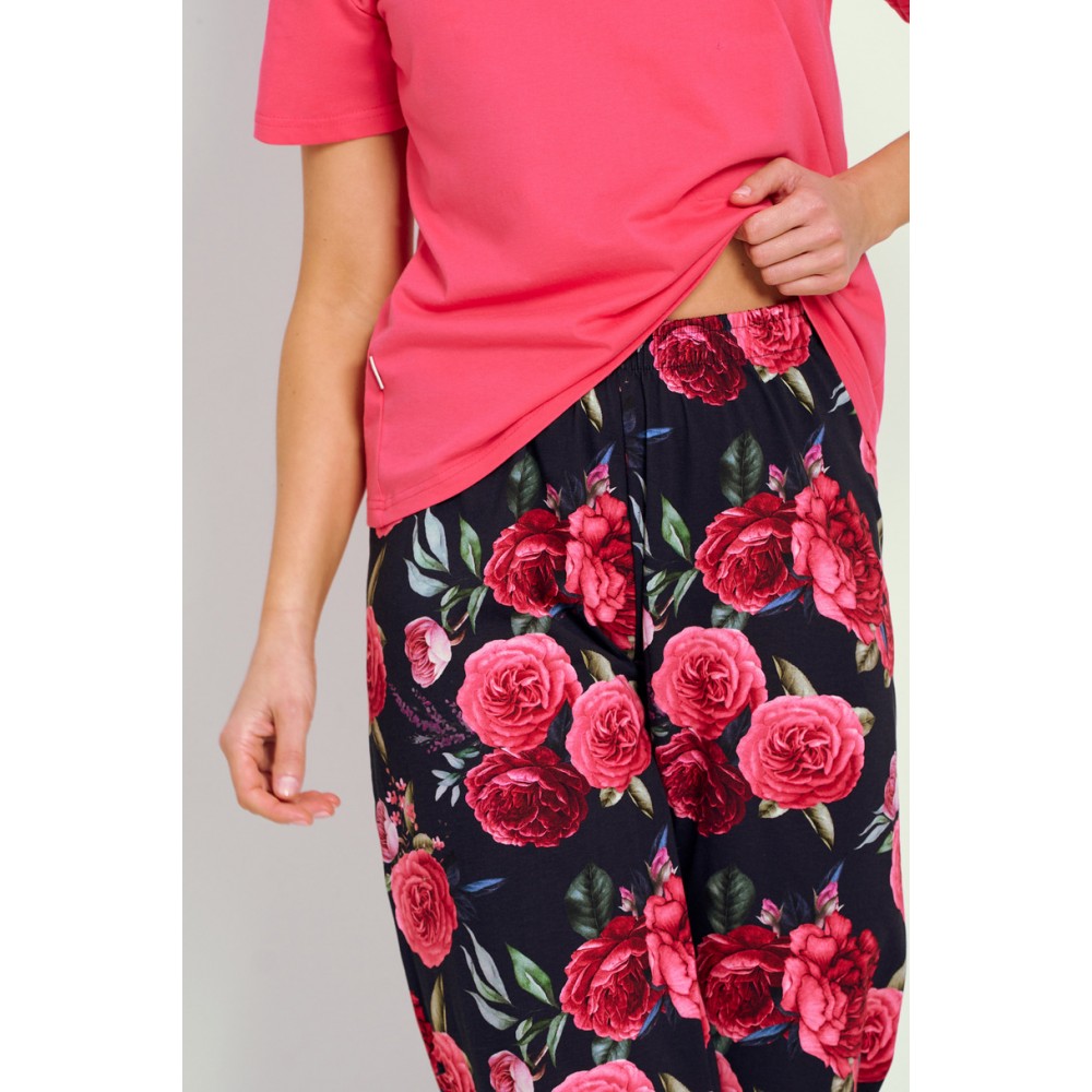 Жіноча піжама з короткими рукавами з м'якої бавовни, з однотонною блузкою та V-подібним вирізом. Штани довжиною 3/4 з візерунком у тон.