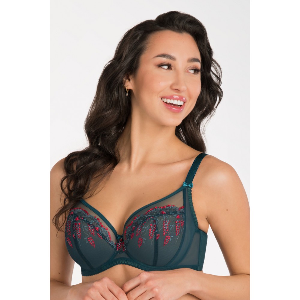 BRA K 796 (конструкція K 630 – MORISSON) М'який бюстгальтер для жінок із середніми та великими грудьми. Модель з поділом чашечок на 4 частини - верхня, передня, середня і бічна панель (бічна підтримка) - округлює бюст в нижній частині, збирає груди в центрі з боку пахви. Виріз горловини піднятий і має форму, щоб надійно закрити всю конструкцію. 4 ширини ремінця (14, 18, 22, 25); гачок з триступеневою регулюванням обхвату: 2 ряд - планка 14; 3 ряди – лямки 18, 22, 25. ЧАШКА: НИЖНЯ ЧАШКА: вишивка + стійкий фатин; БІЧНА ПАНЕЛЬ: 2 шари стійкого тюлю. ВЕРХНЯ ЧАШКА: вишивка на підкладці з стійкого тюлю, верхній край оброблений еластичною стрічкою. ТАЛІЯ: контурна перемичка зі стійкого тюлю та вишивки; прозора лайкра з сітчастою структурою забезпечує дуже хорошу підтримку; Плоскі кісточки з боків забезпечують ідеальне прилягання бюстгальтера до тіла. Червоні металеві колеса та регулятори (без нікелю). Склад: 90% поліамід, 7% еластан, 3% поліестер.