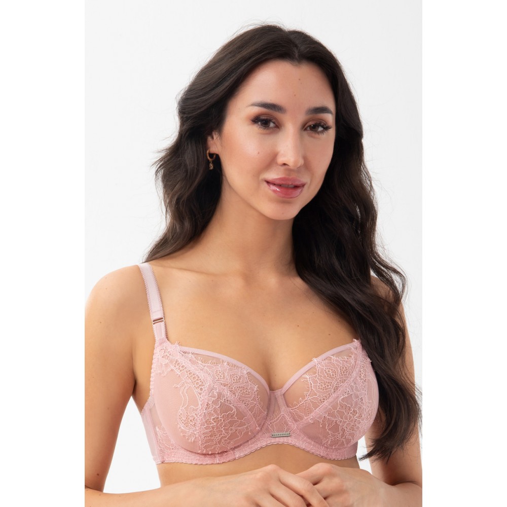М'який бюстгальтер призначений для жінок із середніми та великими грудьми. Забезпечує ефект підйому і збирання бюста всередину, чашечки з 3-х частин зі стійкого шнурка для вій на стійкому тюлі, прошиті декоративною металевою ниткою. Верхній край чаші оброблений гладкою стрічкою. Спинка з прозорої лайкри забезпечує дуже хорошу посадку та підтримку. Бічні кісточки запобігають згортанню матеріалу. Залежно від розміру дво- або трирядні гачки з триступеневою регулюванням окружності. Невідстібні регульовані лямки трьох ширин, додатково укріплені оксамитовою стрічкою великих розмірів. Срібні металеві елементи (без нікелю) Склад: 90% поліамід, 7% еластан, 3% поліестер