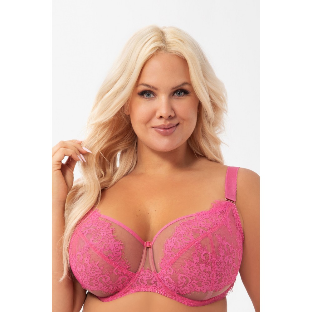 М'який бюстгальтер призначений для жінок із середніми та великими грудьми. Забезпечує ефект підйому і збирання бюста всередину, чашки з 3-х частин зі стійкого шнурка для вій і стійкого тюлю. Верхній край чашки плавно перетікає в лямку, забезпечуючи кращу підтримку бюсту. Спинка з прозорої лайкри забезпечує дуже хорошу посадку та підтримку. Бічні кісточки запобігають згортанню матеріалу. Залежно від розміру дво- або трирядні гачки з триступеневою регулюванням окружності. Невідстібні регульовані лямки трьох ширин, додатково укріплені оксамитовою стрічкою великих розмірів. Металеві елементи з рожевого золота (без нікелю) Склад: 90% поліамід, 7% еластан, 3% поліестер