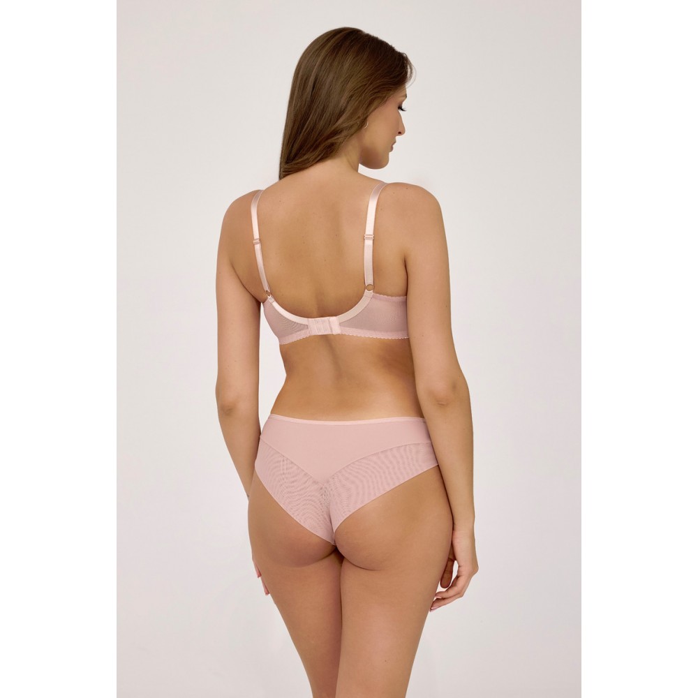 Model AV 2223 – Semi soft - zachwyca subtelną, pudrową barwą w odcieniu różu, która doskonale komponuje się z jasną koronką o misternym, kwiatowym wzorze. Miseczki usztywnione zostały miękką pianką, w dolnej części obszytą gładką dzianiną, a w górnej zdobione koronką, która lekko prześwituje i dodaje konstrukcji romantycznego charakteru. Biustonosz unosi i podtrzymuje piersi, nadając im naturalny, pełny kształt. Mostek wykończony kokardką, a tył z elastycznej dzianiny zapewnia stabilność i wygodę noszenia